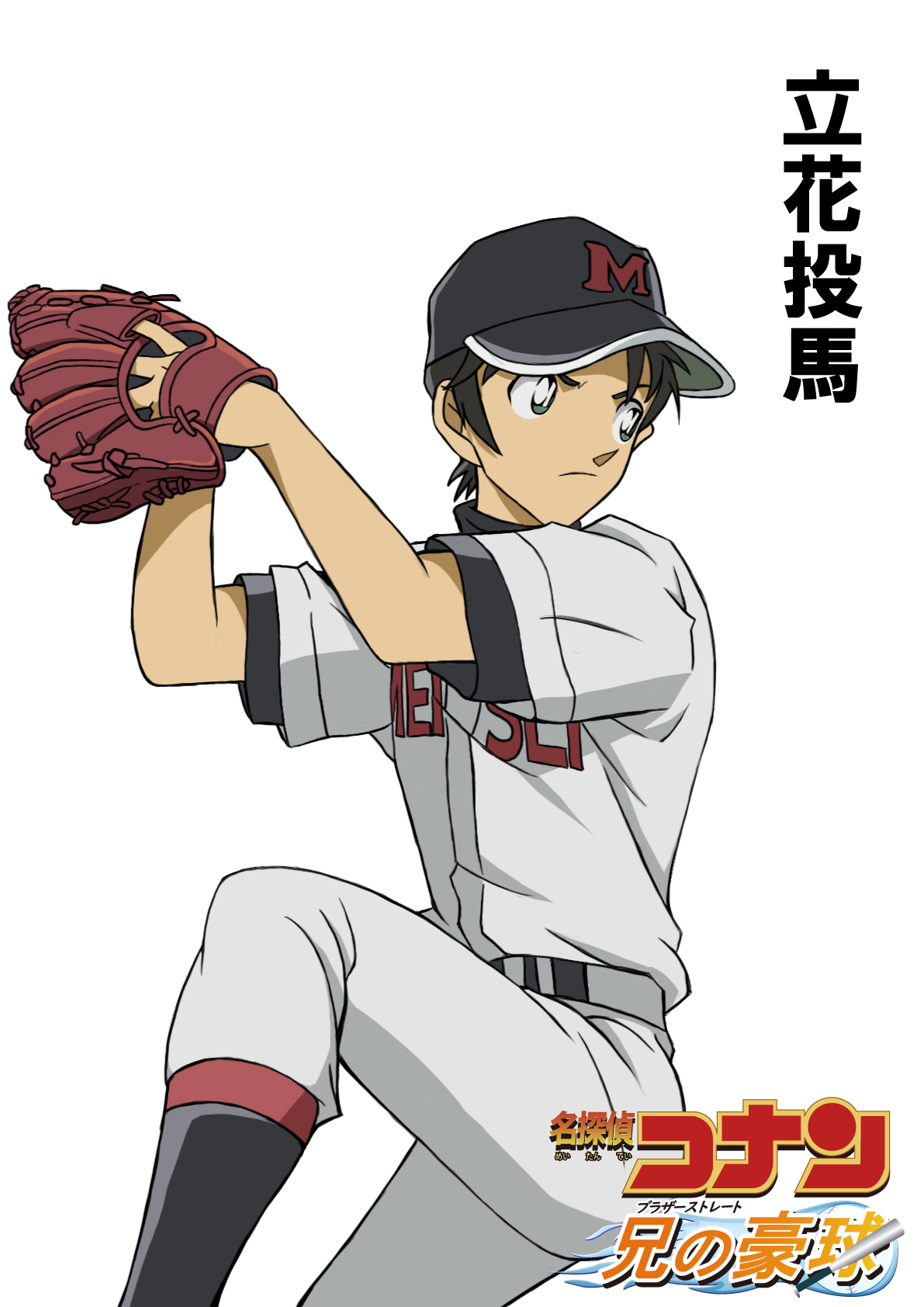 1boy baseball_cap baseball_glove baseball_uniform belt black_belt black_hat black_socks blue_eyes brown_gloves character_name closed_mouth copyright_logo copyright_name feet_out_of_frame gloves hat highres hiko_(jihen_m) logo looking_ahead meitantei_conan mix_(manga) pants parody pitching playing_sports shirt shirt_under_shirt short_sleeves simple_background socks solo sportswear style_parody tachibana_touma undershirt white_background white_pants white_shirt