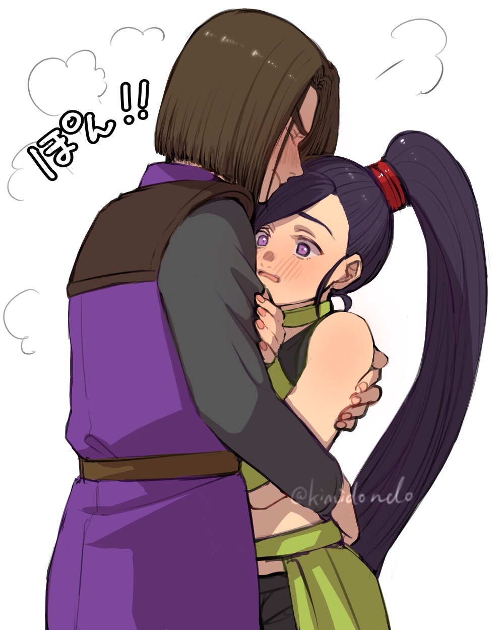 1boy 1girl arm_guards black_shirt black_shorts black_tank_top blush brown_hair choker commentary_request cowboy_shot dragon_quest dragon_quest_xi green_choker hand_on_another's_arm hero_(dq11) high_ponytail highres hug kimidori_(kimidoriri) martina_(dq11) medium_hair open_mouth ponytail profile purple_eyes purple_hair purple_tunic shirt shorts surprised tank_top tunic twitter_username white_background