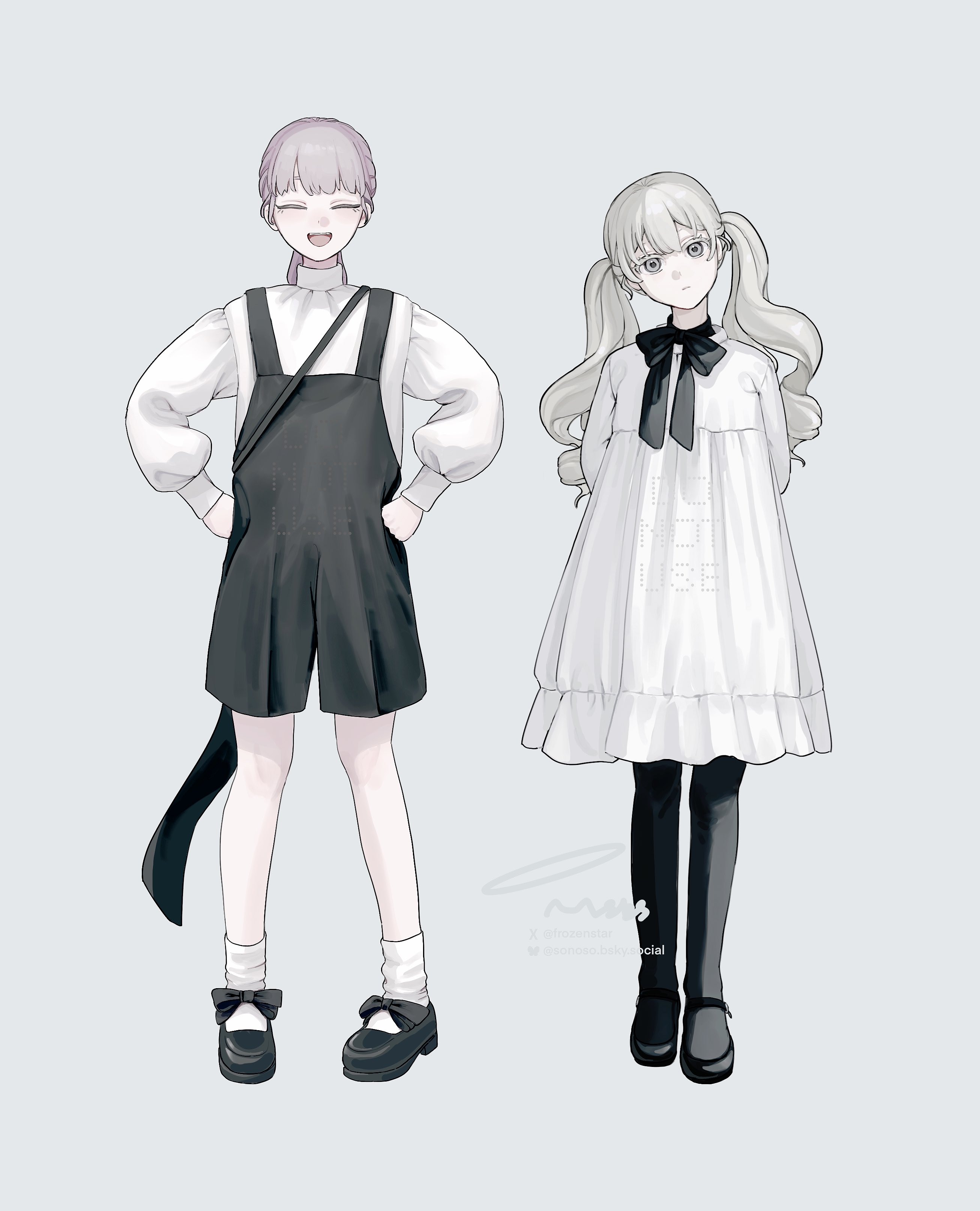 2girls :d absurdres arms_behind_back black_bow black_bowtie black_pantyhose black_ribbon black_shoes blue_overalls bobby_socks bow bowtie closed_eyes closed_mouth curly_hair dress drill_hair facing_viewer footwear_bow frilled_socks frills full_body grey_background grey_eyes grey_hair grus_(vrchat) hands_on_own_hips head_tilt highres lapwing_(vrchat) long_hair long_sleeves looking_at_viewer mary_janes multiple_girls neck_ribbon open_mouth overall_shorts overalls pantyhose ponytail puffy_long_sleeves puffy_sleeves purple_hair ribbon shirt shoes simple_background smile socks sorairo_no_sora standing sweater turtleneck turtleneck_sweater twintails vrchat white_dress white_eyes white_shirt white_socks white_sweater