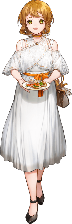 1girl bag black_shoes brown_hair choker commentary_request dress food full_body hair_ribbon handbag hozuka_(kadokawa) kantai_collection long_hair looking_at_viewer official_alternate_costume official_art ootomari_(anniversary)_(kancolle) ootomari_(kancolle) orange_choker plate ribbon shoes smile solo translation_request white_dress yellow_eyes