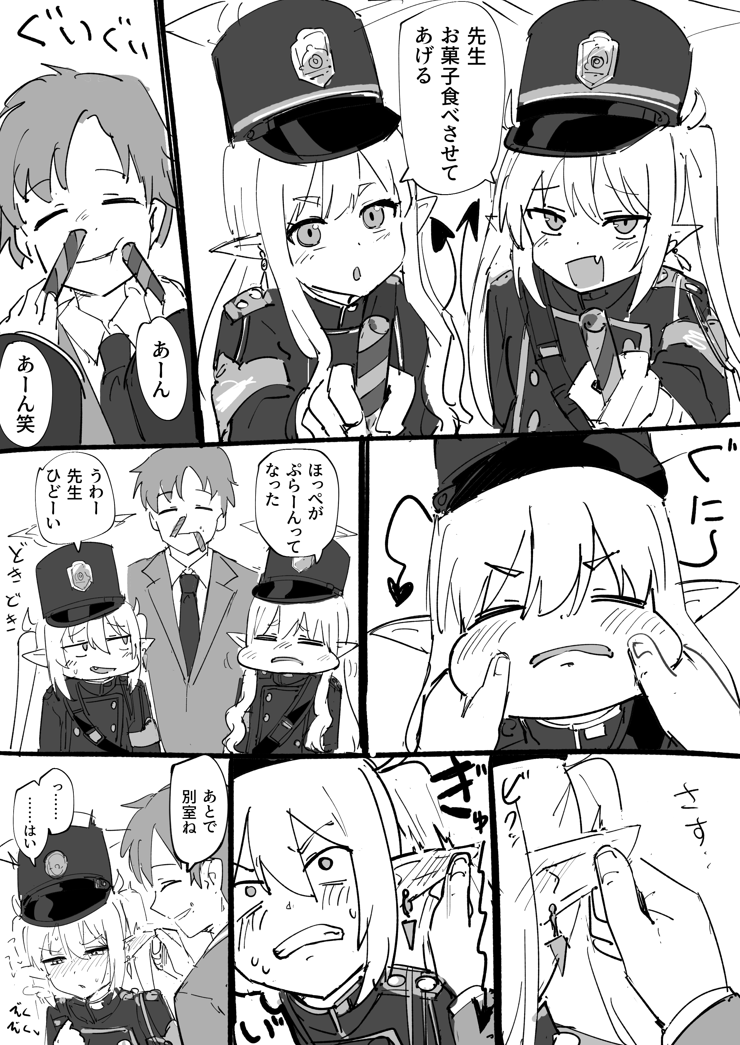 1boy 2girls absurdres blue_archive blush candy cheek_pinching demon_girl demon_tail fang food greyscale hair_between_eyes halo hand_on_another's_ear hat highres hikari_(blue_archive) holding holding_candy holding_food jacket japanese_text long_hair monochrome multiple_girls necktie nozomi_(blue_archive) open_mouth peaked_cap pinching pointy_ears sensei_(blue_archive) sensei_(blue_archive_the_animation) shirt sidelocks tail tenten_(chan4545) translation_request twintails