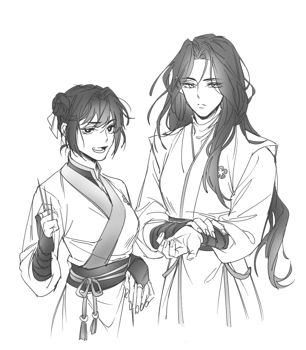 2girls chinese_clothes closed_mouth cowboy_shot double_bun gahya00 greyscale hair_bun hair_ribbon hanfu holding holding_needle korean_commentary long_hair long_sleeves looking_at_viewer lower_teeth_only monochrome multiple_girls needle open_mouth return_of_the_mount_hua_sect ribbon sash simple_background tang_soso_(return_of_the_mount_hua_sect) teeth yu_iseol_(return_of_the_mount_hua_sect)