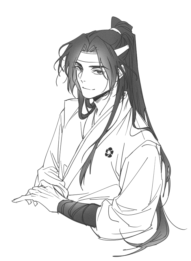1boy alternate_hairstyle baekcheon_(return_of_the_mount_hua_sect) chinese_clothes closed_mouth gahya00 greyscale half_updo hanfu headband high_ponytail korean_commentary long_hair long_sleeves looking_at_viewer male_focus monochrome ponytail return_of_the_mount_hua_sect simple_background smile solo upper_body