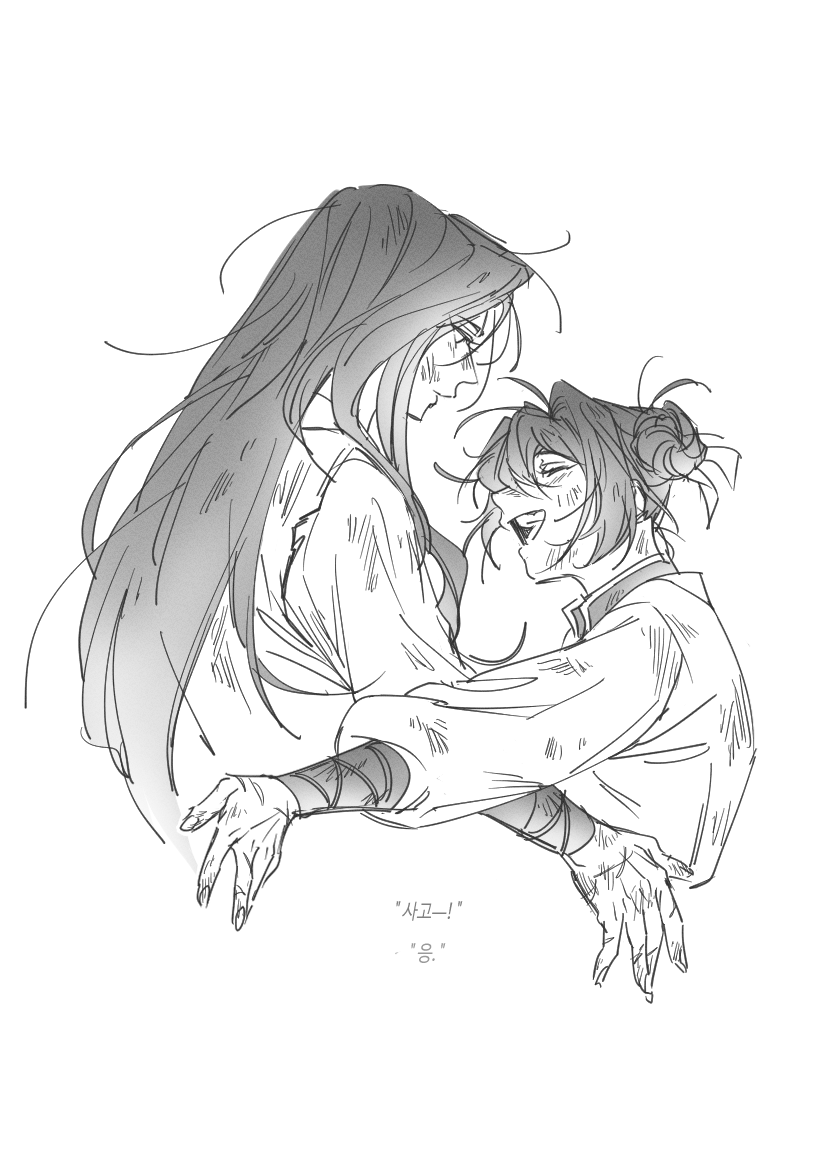 2girls chinese_clothes closed_eyes closed_mouth double_bun from_side gahya00 greyscale hair_bun hair_ribbon hanfu korean_commentary korean_text long_hair long_sleeves looking_at_another monochrome multiple_girls open_mouth return_of_the_mount_hua_sect ribbon scratches simple_background smile tang_soso_(return_of_the_mount_hua_sect) torn_clothes yu_iseol_(return_of_the_mount_hua_sect)