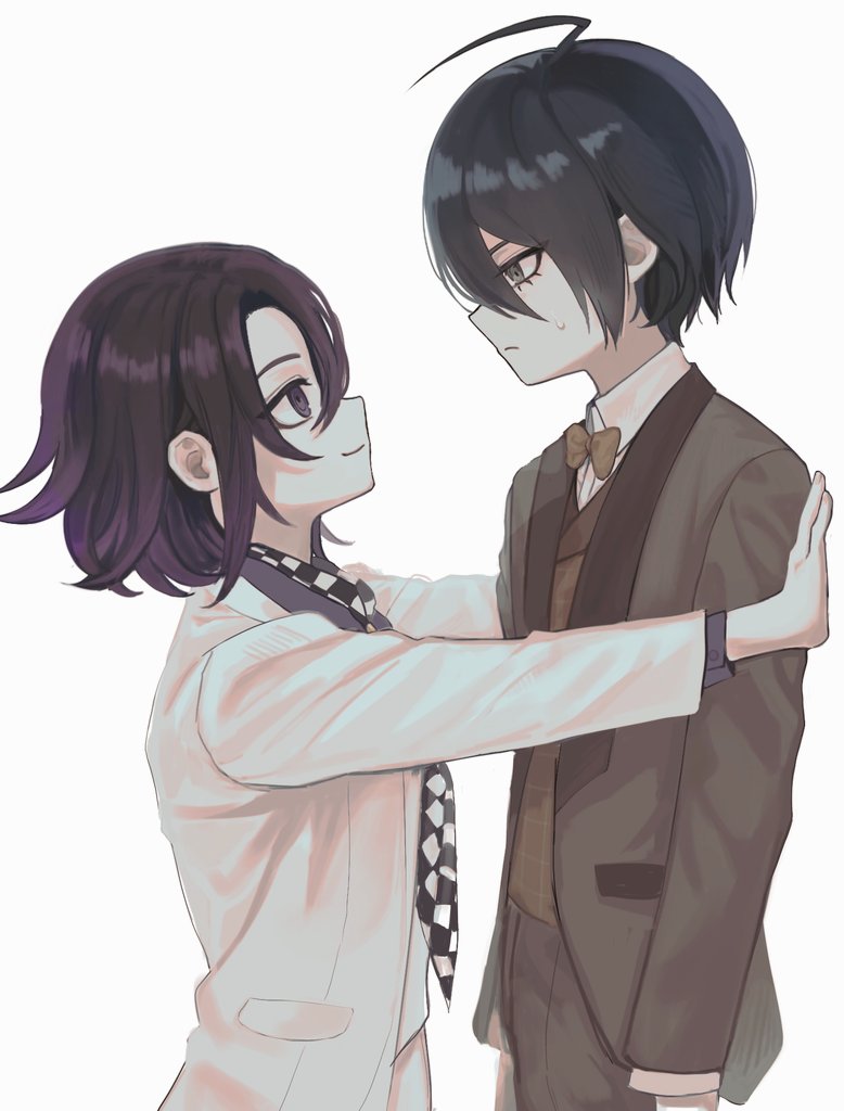 2boys ahoge black_hair brown_eyes brown_jacket brown_pants checkered_neckerchief danganronpa_(series) danganronpa_10th_anniversary_costume danganronpa_v3:_killing_harmony flipped_hair from_side hair_between_eyes jacket male_focus multiple_boys neckerchief oeeo197 official_alternate_costume oma_kokichi open_clothes open_jacket pants saihara_shuichi short_hair simple_background sweatdrop white_background white_jacket