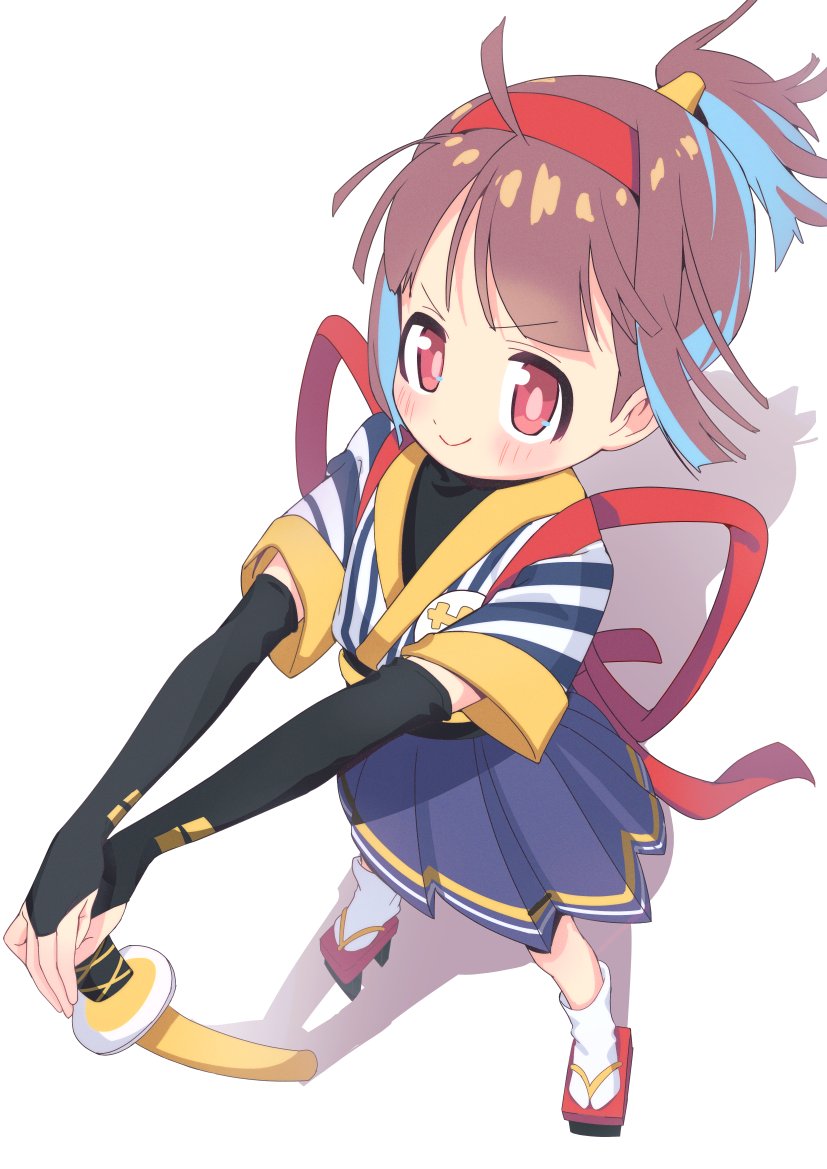 1girl black_gloves blue_hair blush bridal_gauntlets brown_eyes brown_hair commentary cosplay elbow_gloves full_body geta gloves hairband hands_on_hilt hozuki_momiji imadake_dabuchi_tabemi katana legs_apart looking_at_viewer mcdonald's mochitsuki_kagami multicolored_hair onii-chan_wa_oshimai! planted planted_sword planted_weapon ponytail red_hairband samurai_tamago_tabemi samurai_tamago_tabemi_(cosplay) sheath sheathed short_hair short_ponytail short_sleeves simple_background smile solo standing striped_clothes sword tabi two-tone_hair v-shaped_eyebrows weapon white_background