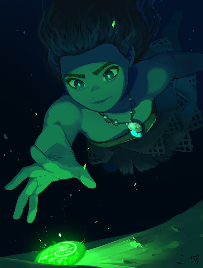 1girl arm_at_side bare_shoulders barefoot black_hair breasts brown_eyes closed_mouth dark-skinned_female dark_skin disney diving floating_hair gem green_gem jewelry long_hair looking_at_object looking_down moana_(movie) moana_waialiki naughty_face necklace night outstretched_arm pano_(mohayayamai) reaching red_tube_top sand small_breasts smile solo strapless thick_eyebrows tube_top underwater wavy_hair