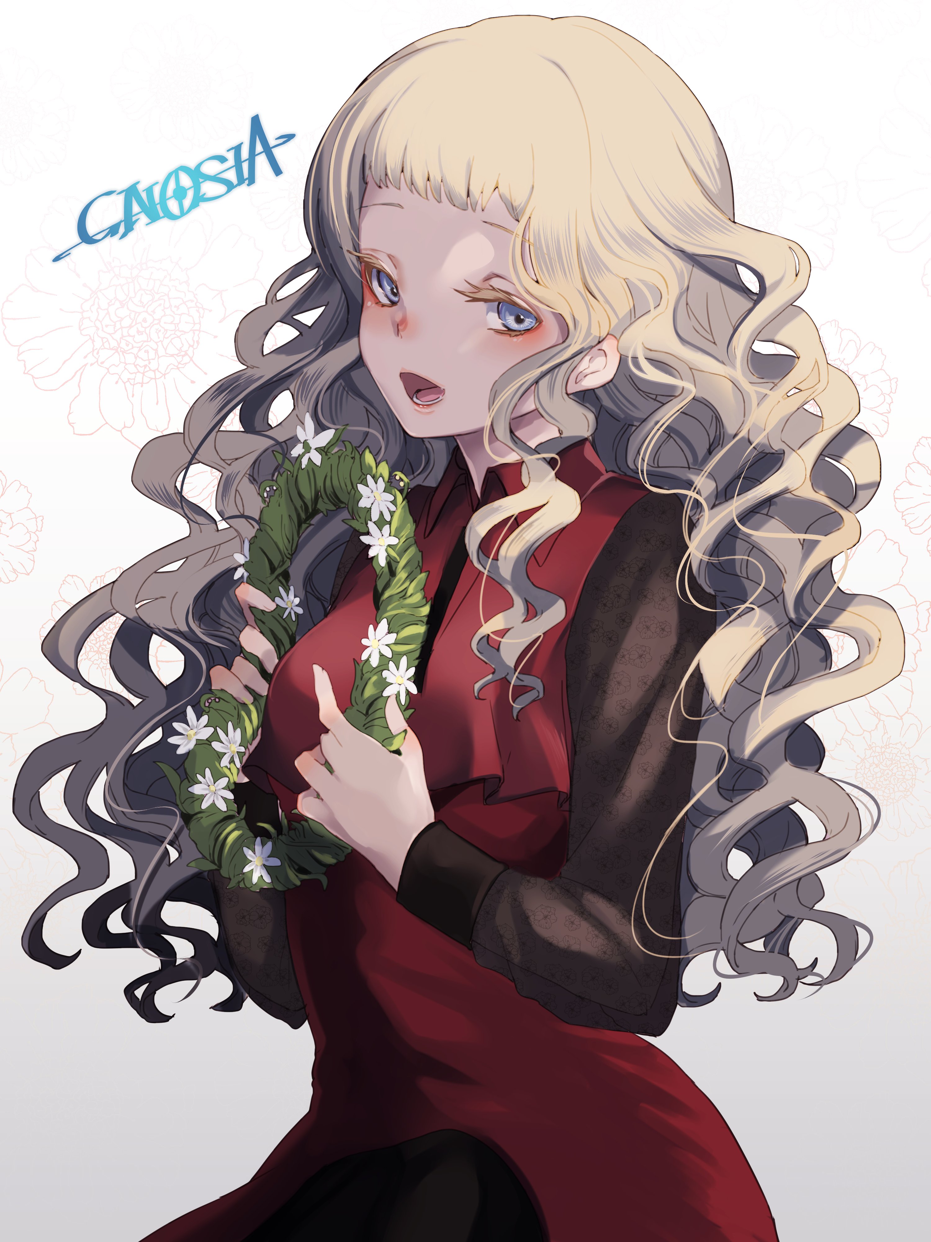 1girl absurdres brown_hair dress eyelashes gnosia hair_between_eyes highres kukrushka_(gnosia) long_hair long_sleeves looking_at_viewer lugh shirt simple_background smile solo upper_body wavy_hair