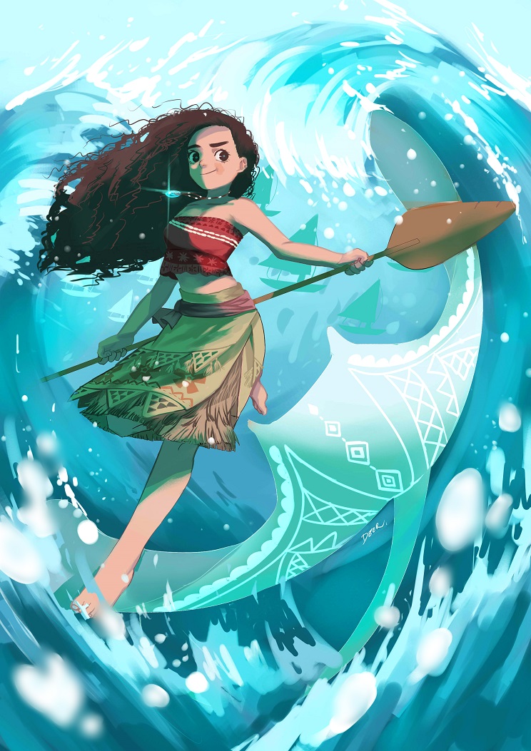 1girl bare_shoulders brown_eyes brown_hair curly_hair dark-skinned_female dark_skin deer_(deer423-81) holding holding_oar jewelry long_hair looking_at_viewer moana_(movie) moana_waialiki necklace oar smile solo strapless tattoo tattoo_sleeve tribal_tattoo water