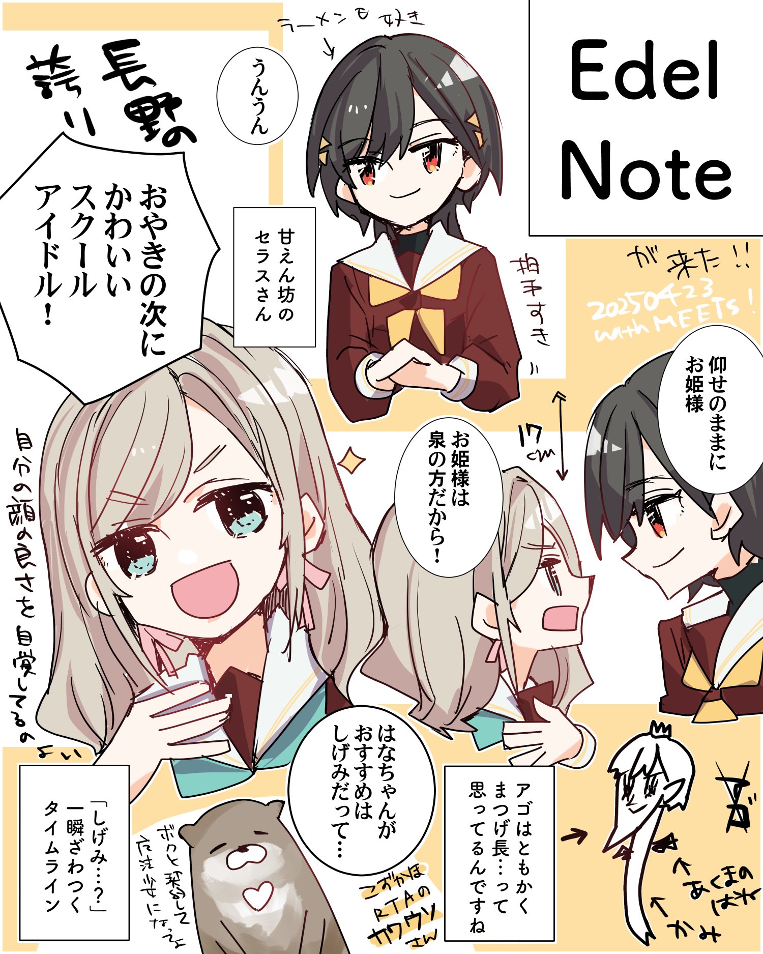 2girls :d aqua_neckerchief arrow_(symbol) black_hair blue_eyes brown_dress ceras_yanagida_lilienfeld closed_eyes closed_mouth commentary_request crown dated demon_wings doodle_inset dress edel_note grey_hair group_name hair_ornament hair_ribbon hasu_no_sora_school_uniform height_difference highres kanduki_kamibukuro katsuragi_izumi link!_like!_love_live! long_hair long_sleeves love_live! multiple_girls multiple_views neckerchief open_mouth orange_eyes otter otter_(hasu_no_sora) own_hands_together pink_ribbon profile ribbon sailor_collar sailor_dress school_uniform smile speech_bubble swept_bangs translation_request triangle_hair_ornament v-shaped_eyebrows virtual_youtuber white_sailor_collar wings winter_uniform wolf_cut yellow_neckerchief