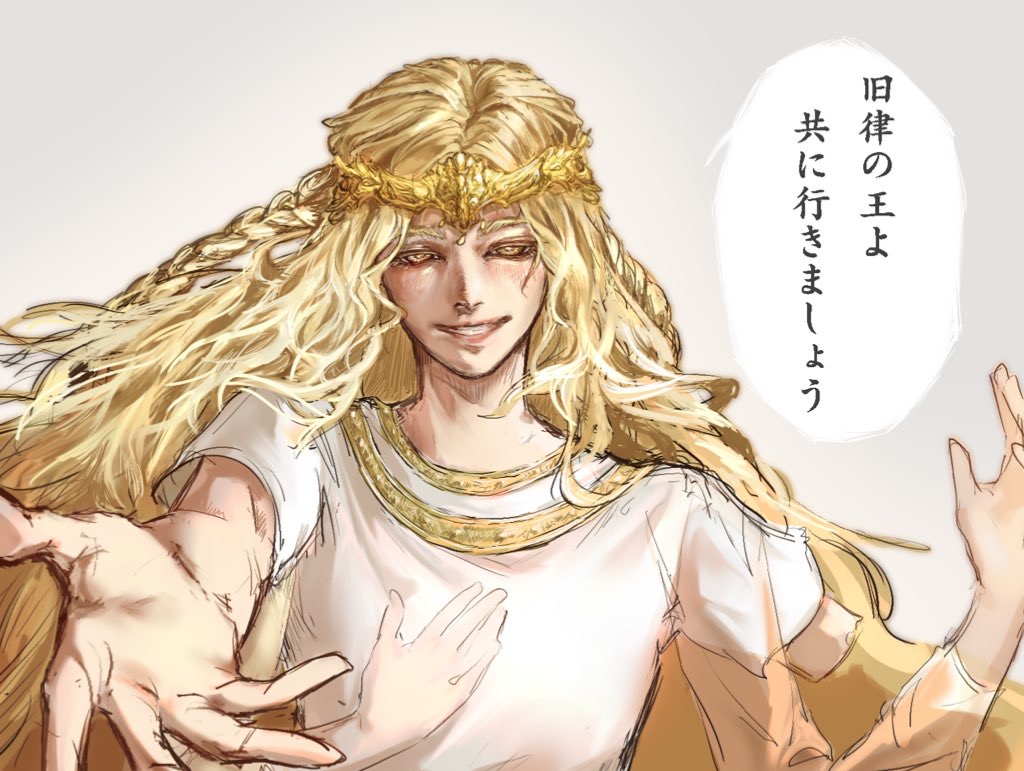 1boy blonde_hair braid circlet commentary elden_ring elden_ring:_shadow_of_the_erdtree extra_arms gold_circlet gold_trim japanese_text long_hair looking_at_viewer miquella_(elden_ring) nunun2525 reaching reaching_towards_viewer side_braids sleeveless_tunic smile solo speech_bubble translated tunic very_long_hair wavy_hair white_background white_tunic yellow_eyes