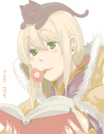 1girl :3 animal animal_on_head black_cat blonde_hair blush book brown_cape cape cat cat_on_head closed_mouth commentary_request dress flower flower_in_mouth fur-trimmed_cape fur_trim green_eyes holding holding_book looking_at_viewer lowres on_head open_book pink_flower purple_dress ragnarok_online simple_background smile solo upper_body waya_(takaomi777) white_background wizard_(ragnarok_online)