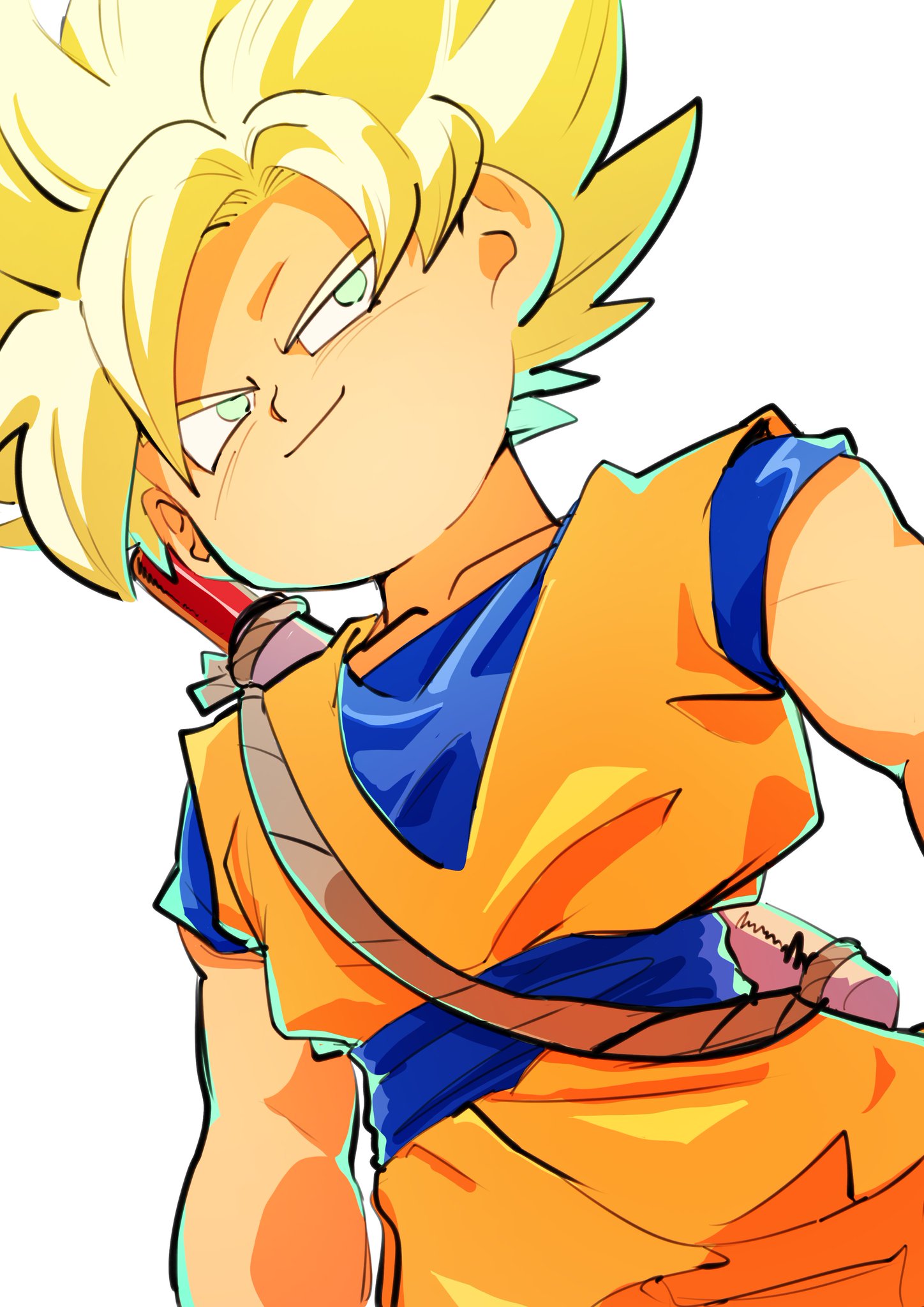 1boy blonde_hair dragon_ball dragon_ball_daima highres male_focus medium_hair orange_pants orange_tunic pants rope shikemoku simple_background smile solo son_goku spiked_hair super_saiyan super_saiyan_1 tunic upper_body white_background
