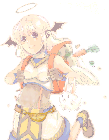 1girl backpack bag black_wings blonde_hair blush carrot closed_mouth commentary_request crop_top foot_out_of_frame gloves grey_eyes grey_gloves grey_shirt grey_shoes halo head_wings long_hair looking_at_viewer lowres lunatic_(ragnarok_online) rabbit ragnarok_online red_bag shirt shoes shorts simple_background smile solo super_novice_(ragnarok_online) traditional_halo walking waya_(takaomi777) white_background white_shirt white_shorts wings yellow_halo