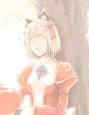 1girl :3 animal_ears blonde_hair blush bow cat_ears cat_girl closed_eyes commentary_request dress hair_bow high_priest_(ragnarok_online) juliet_sleeves long_sleeves lowres parted_lips poring puffy_sleeves ragnarok_online red_bow red_dress short_hair sleeping sleeping_upright slime_(creature) solo squeans tree two-tone_dress under_tree upper_body waya_(takaomi777) white_dress