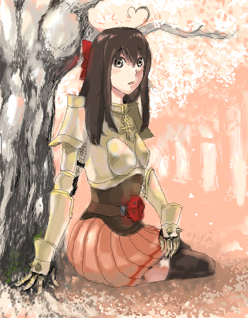 1girl ahoge armor black_thighhighs blush boobplate bow breastplate brown_eyes brown_hair cherry_blossoms commentary_request cross_of_prontera full_body hair_bow heart heart_ahoge long_hair looking_at_viewer lord_knight_(ragnarok_online) lowres miniskirt open_mouth pauldrons pink_skirt ragnarok_online red_bow shoulder_armor sitting skirt solo spiked_gauntlets thighhighs tree under_tree waya_(takaomi777) yokozuwari