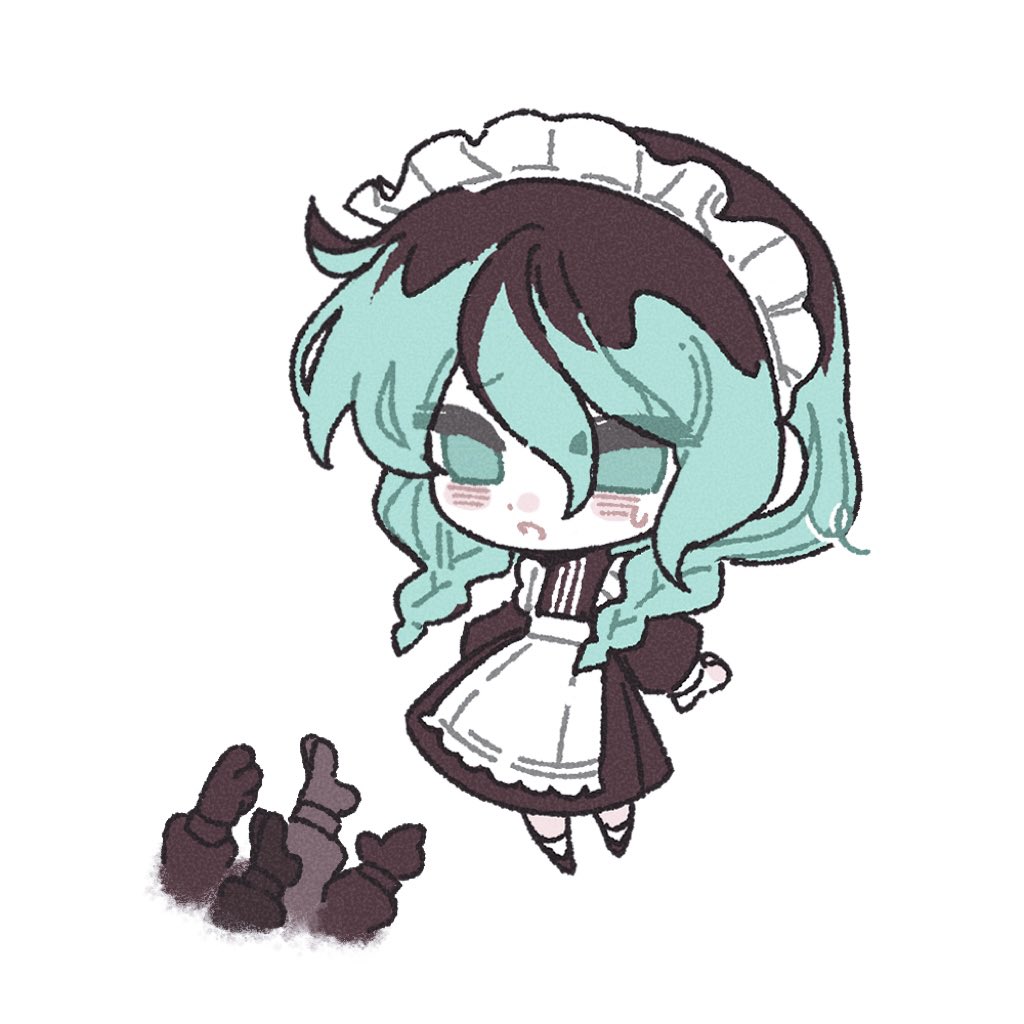 1girl alternate_costume alternate_hair_color alternate_hairstyle apron aqua_eyes aqua_hair bags_under_eyes black_dress black_hair braid chibi chibi_only disembodied_hand dress hair_between_eyes hair_over_shoulder hatsune_miku long_hair long_sleeves low_twin_braids maid maid_apron maid_headdress multicolored_hair nervous open_mouth reaching reaching_towards_another saji_no_majinai_(vocaloid) simple_background small_sweatdrop solo standing there_is_no_crow twin_braids two-tone_hair vocaloid waist_apron white_background