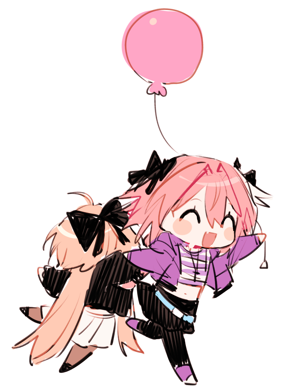 1boy 1girl astolfo_(fate) astolfo_(memories_at_trifas)_(fate) balloon belt black_bow black_pantyhose black_shoes black_skirt blonde_hair bow check_commentary chibi chibi_only commentary_request crop_top crossdressing crossdressing_(mtf) dragging fate/grand_order fate_(series) hair_intakes highres holding holding_balloon jacket koyashaka liss_meier_(koyashaka) midriff miniskirt original pantyhose pink_jacket pink_shoes pink_skirt shoes skirt sneakers trap twintails white_skirt