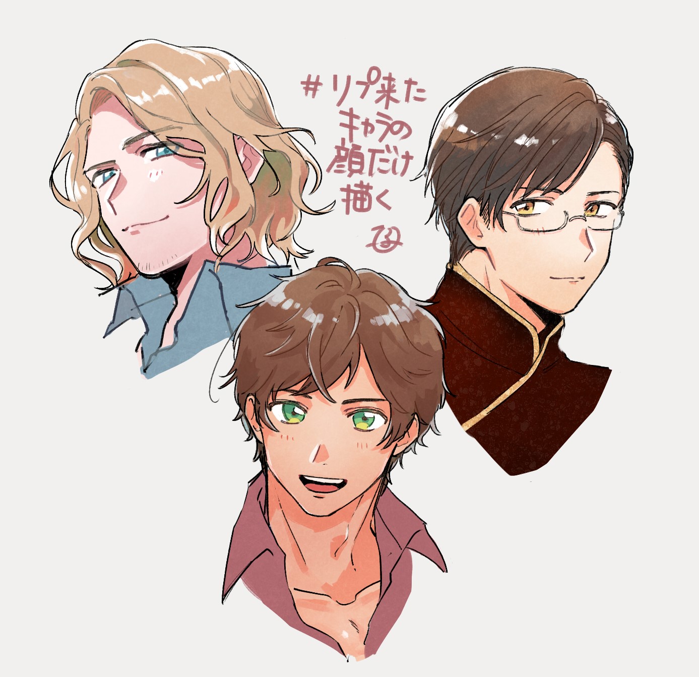 3boys axis_powers_hetalia blonde_hair blue_eyes blue_shirt brown_hair changpao chinese_clothes closed_mouth collarbone collared_shirt commentary_request facial_hair france_(hetalia) glasses green_eyes highres looking_at_viewer macau_(hetalia) male_focus mandarin_collar mirin_yari multiple_boys open_mouth red_shirt semi-rimless_eyewear shirt short_hair simple_background smile spain_(hetalia) tan teeth wavy_hair white-framed_eyewear white_background yellow_eyes