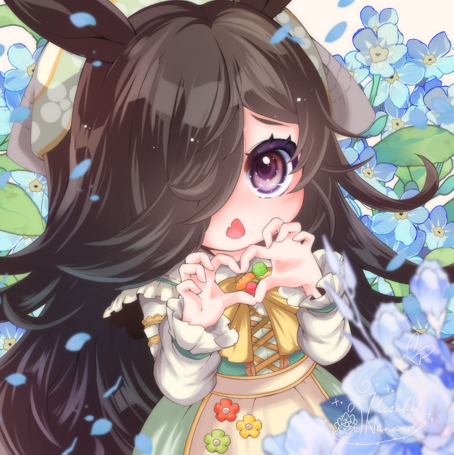 1girl aged_down animal_ears apron asymmetrical_bangs blue_flower bodice bow bowtie brown_hair commentary_request dress fang flipped_hair flower frilled_shirt_collar frilled_sleeves frills green_dress hair_over_one_eye headscarf heart heart_hands highres horse_ears kaibun_dou long_bangs long_hair long_sleeves looking_at_viewer official_alternate_costume open_mouth pinafore_dress puritan_collar purple_eyes rice_shower_(umamusume) rice_shower_(yummy_dreamy_fairy)_(umamusume) shirt skin_fang sleeveless sleeveless_dress solo triangle_mouth umamusume very_long_hair waist_apron white_headscarf white_shirt yellow_apron yellow_bow yellow_bowtie
