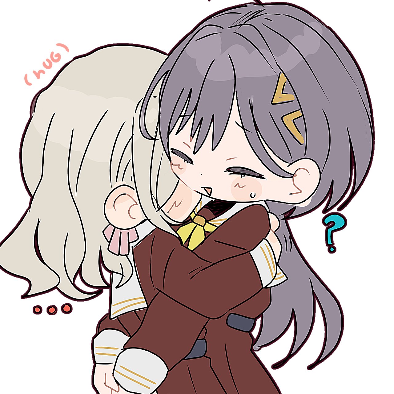 ... 2girls ? blush brown_dress ceras_yanagida_lilienfeld closed_eyes col_person cowboy_shot deformed dress edel_note english_text grey_hair hair_ornament hair_ribbon hasu_no_sora_school_uniform highres hug katsuragi_izumi link!_like!_love_live! long_hair long_sleeves love_live! multiple_girls neckerchief pink_ribbon pleated_dress raised_inner_eyebrows ribbon sailor_collar sailor_dress school_uniform simple_background sweatdrop triangle_hair_ornament virtual_youtuber white_background white_sailor_collar winter_uniform wolf_cut yellow_neckerchief