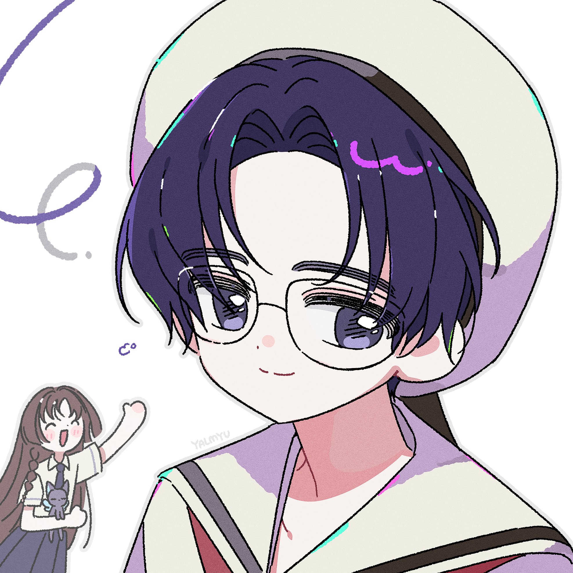 1boy 1girl :d ^_^ akizuki_nakuru arm_up artist_name blue_necktie blue_skirt blush_stickers braid brown_hair cardcaptor_sakura closed_eyes closed_mouth collared_shirt glasses grey_outline hat highres hiiragizawa_eriol long_hair necktie open_mouth outline parted_bangs pleated_skirt portrait purple_eyes purple_hair sailor_collar school_uniform serafuku shirt short_hair short_sleeves simple_background single_braid skirt smile tomoeda_middle_school_uniform white_background white_hat white_sailor_collar white_shirt yalmyu