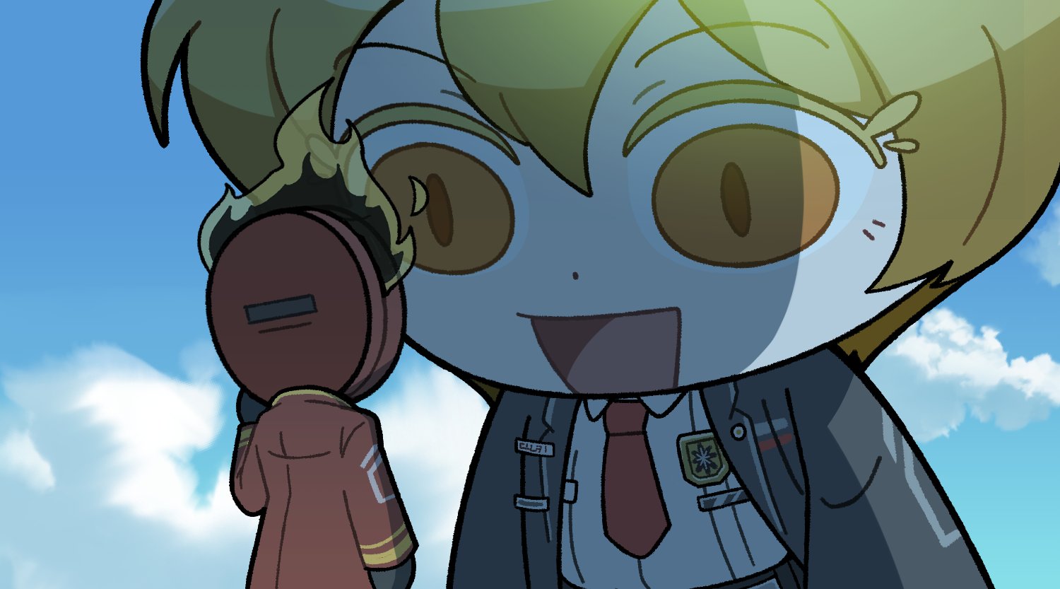 1girl 1other black_coat black_gloves black_pants blonde_hair cape chibi clock coat dante_(limbus_company) did_you_want_to_talk?_(meme) don_quixote_(project_moon) fire giant giantess gloves lapels limbus_company long_sleeves meme necktie notched_lapels object_head open_mouth pants project_moon red_cape red_necktie shirt short_hair smile tomodachi_life tomodachi_life:_living_the_dream uuu_(gyojamandu) white_shirt