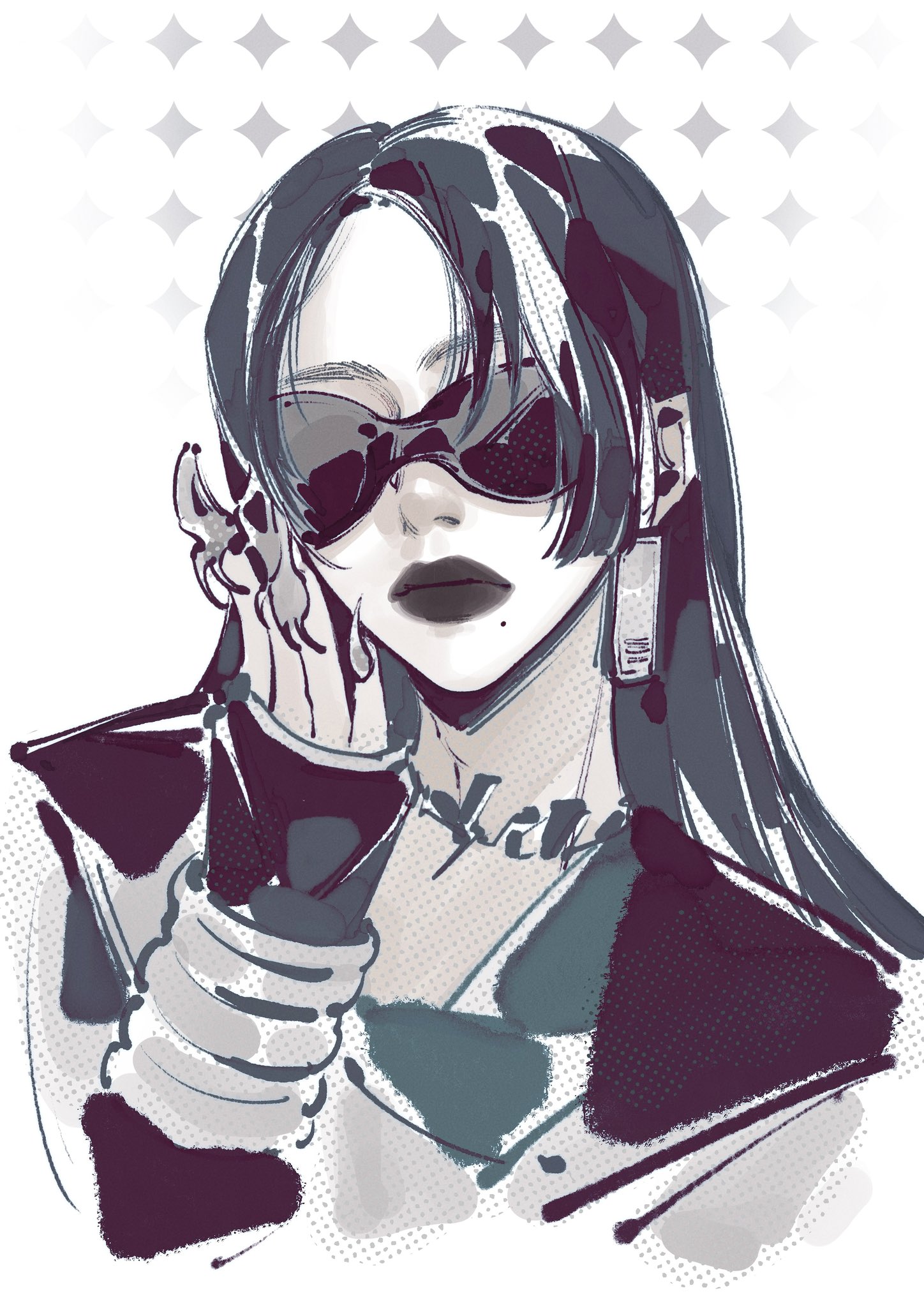 1girl aespa closed_mouth commentary earrings fingernails greyscale highres jewelry k-pop karina_(aespa) long_fingernails mole monochrome real_life sidelocks solo sunglasses untranslatable_commentary upper_body yuanwei_shaoya
