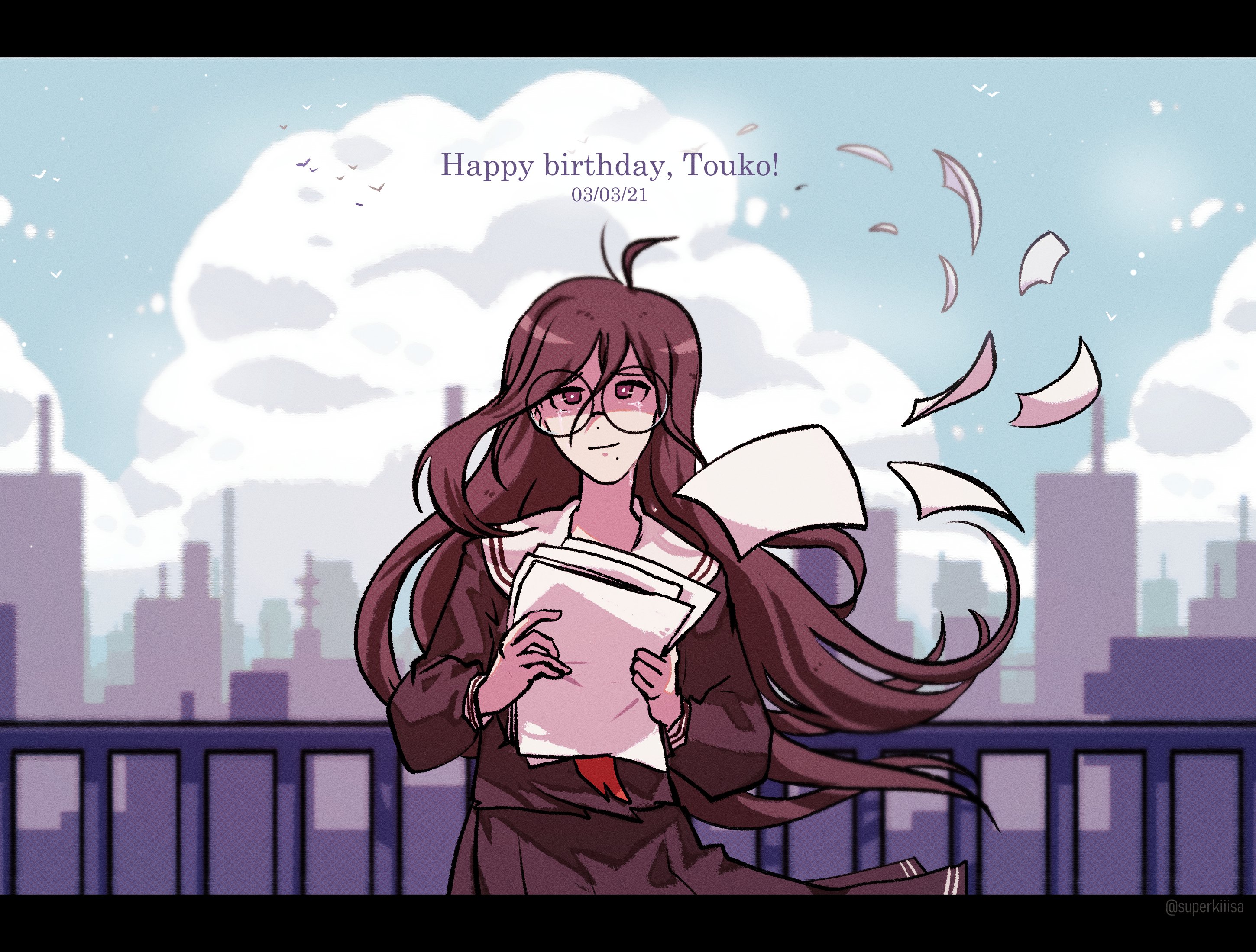 1girl ahoge black_serafuku black_shirt black_skirt blue_sky brown_hair building character_name city closed_mouth cloud collared_shirt crying crying_with_eyes_open danganronpa_(series) danganronpa_another_episode:_ultra_despair_girls dated fukawa_toko glasses happy_birthday highres holding holding_paper letterboxed lily_(superkiiisa) long_hair long_sleeves mole mole_under_mouth neckerchief paper purple_eyes railing red_neckerchief round_eyewear sailor_collar school_uniform serafuku shirt skirt sky smile solo tears torn_clothes torn_neckerchief torn_shirt twitter_username white_sailor_collar wind