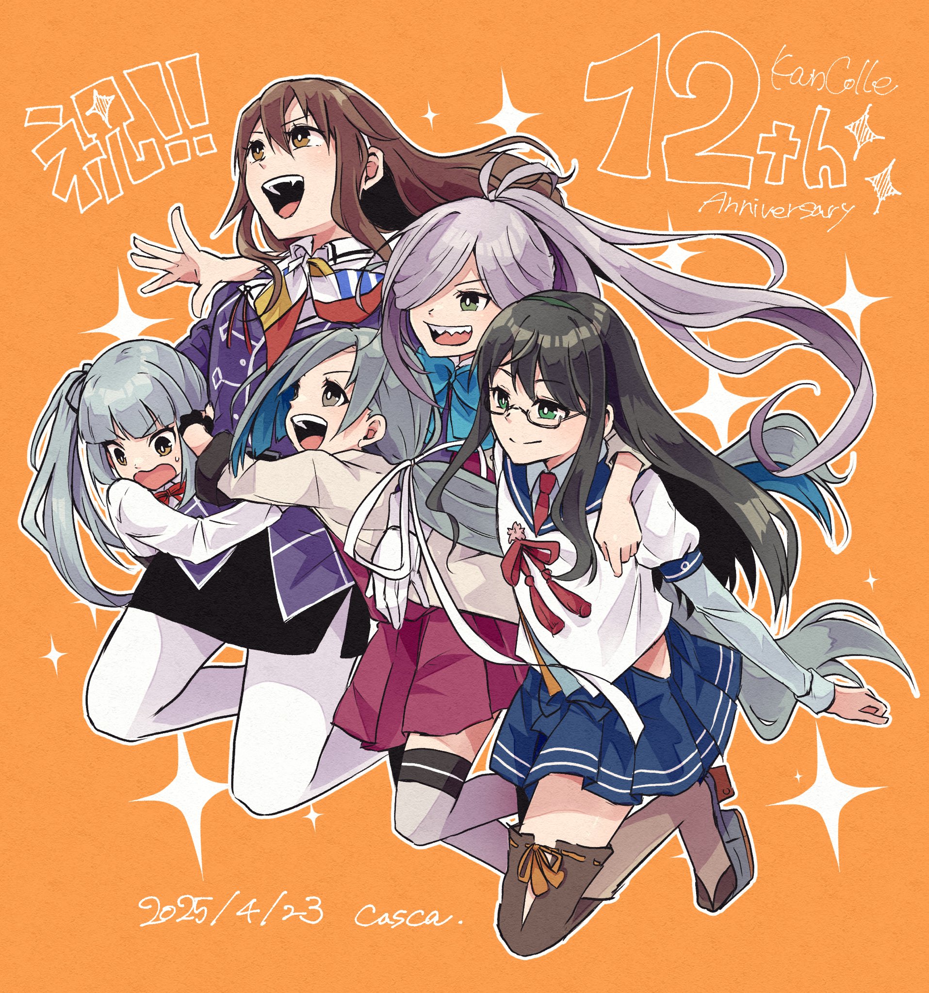 5girls asashimo_(kancolle) ashigara_(kancolle) ashigara_kai_ni_(kancolle) blazer blue_sailor_collar blue_skirt brown_hair casca_(casca_bask) collared_shirt dress dress_shirt glasses grey_hair grey_jacket greyscale halter_dress halterneck highres jacket jumping kantai_collection kasumi_(kancolle) kasumi_kai_ni_(kancolle) kiyoshimo_(kancolle) kiyoshimo_kai_ni_(kancolle) long_hair low_twintails military_uniform monochrome multiple_girls ooyodo_(kancolle) orange_background pantyhose pleated_skirt ponytail purple_dress purple_jacket sailor_collar school_uniform serafuku sharp_teeth shirt side_ponytail skirt teeth twintails white_pantyhose white_shirt