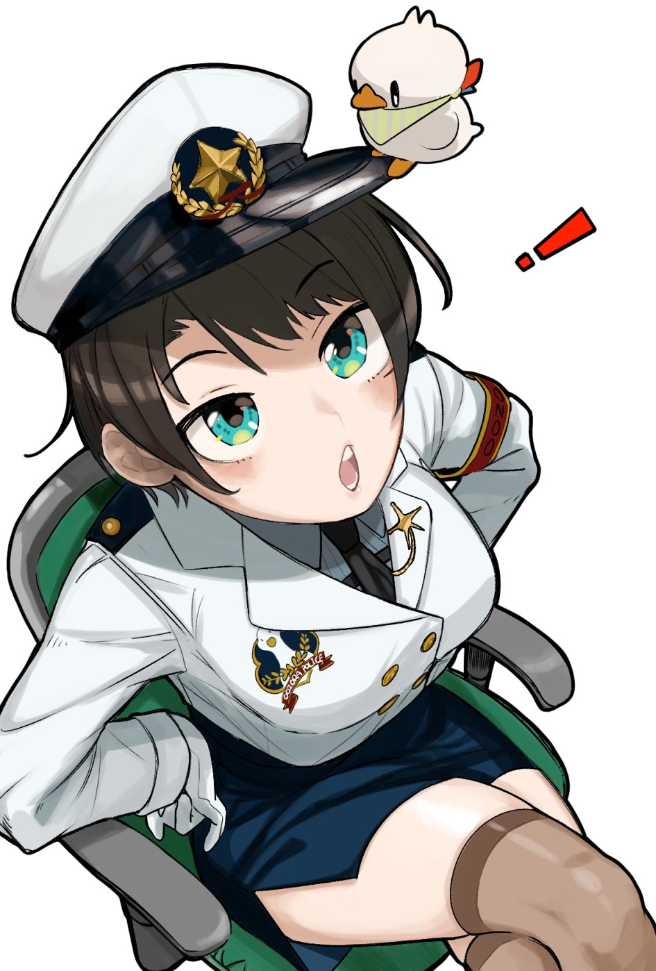 ! 1girl animal animal_on_head aqua_eyes armband bird bird_on_head black_hair black_necktie blue_shirt blue_skirt blush brown_thighhighs buttons chair coat collared_shirt commentary crossed_legs double-breasted feet_out_of_frame from_above gloves hands_on_own_hips hat highres hololive koro_yama56 long_sleeves looking_at_viewer looking_up miniskirt necktie official_alternate_costume on_head oozora_subaru oozora_subaru_(police) open_mouth pencil_skirt police police_hat police_uniform policewoman shirt short_hair simple_background sitting skirt solo star_(symbol) subatomo_(small) swept_bangs swivel_chair thighhighs virtual_youtuber white_background white_coat white_gloves white_hat wing_collar zettai_ryouiki