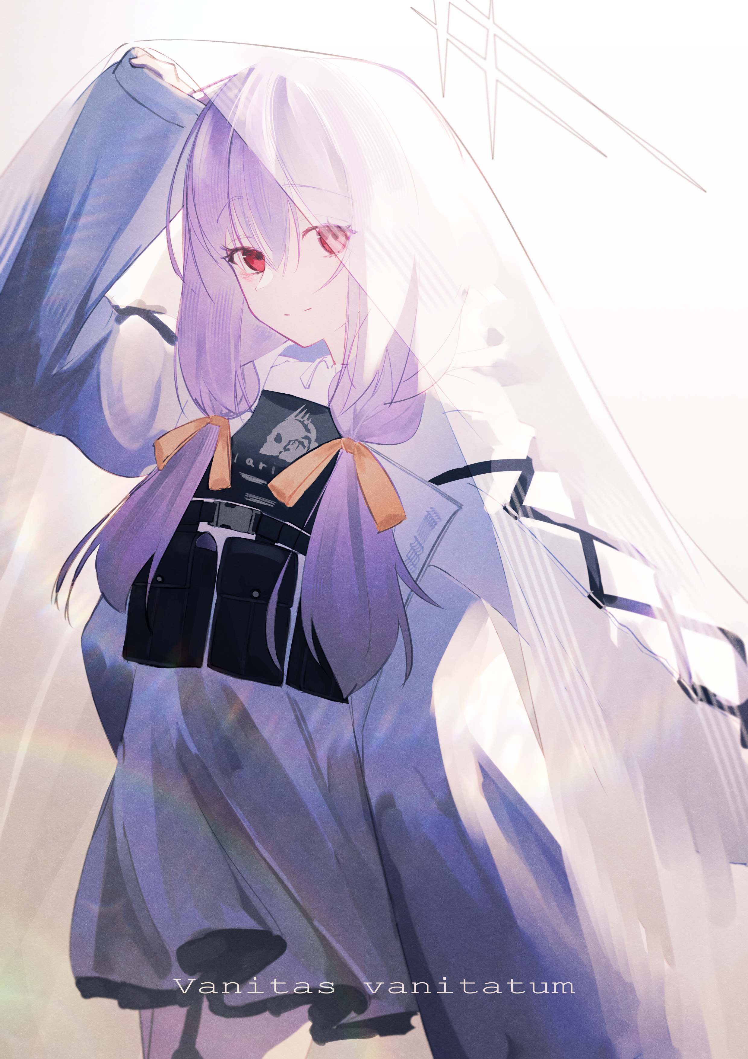 1girl absurdres akatoshu arm_up atsuko_(blue_archive) blue_archive closed_mouth commentary_request dress hair_over_shoulder halo highres long_hair long_sleeves looking_at_viewer purple_eyes purple_hair see-through_clothes see-through_veil smile solo veil white_dress white_halo