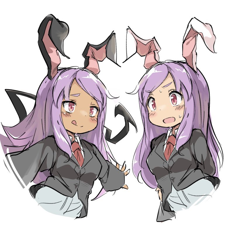 2girls :q animal_ears berazasu black_hisui_(cookie) black_jacket blazer blush breasts closed_mouth collared_shirt commentary_request cookie_(touhou) dark-skinned_female dark_skin demon_tail hisui_(cookie) jacket long_hair long_sleeves medium_breasts multiple_girls necktie open_mouth purple_hair rabbit_ears rabbit_girl red_eyes red_necktie reisen_udongein_inaba shirt simple_background smile swept_bangs tail tongue tongue_out touhou upper_body white_background white_shirt