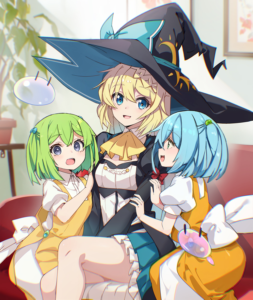 3girls aizawa_azusa apron aqua_skirt black_dress black_hat blonde_hair blue_eyes blue_hair breasts couch dress eyebrows_hidden_by_hair falfa_(slime_taoshite_300_nen) green_hair hair_between_eyes hair_ornament hat hug hug_from_side large_hat large_ribbon looking_at_viewer medium_hair mother_and_child mother_and_daughter multiple_girls nyoro_(nyoronyoro000) on_couch open_mouth parent_and_child plant potted_plant ribbon shalsha_(slime_taoshite_300_nen) siblings sisters sitting skirt slime_(creature) slime_taoshite_300_nen_shiranai_uchi_ni_level_max_ni_nattemashita small_breasts smile twins waist_ribbon white_dress white_ribbon witch witch_hat yellow_apron