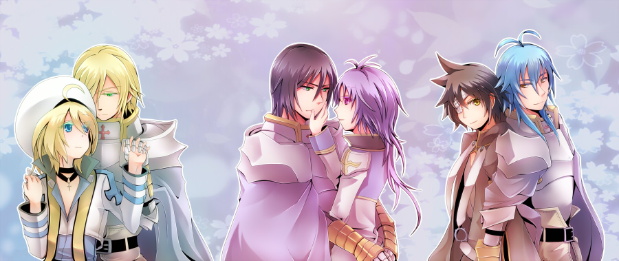 6+boys antenna_hair arch_bishop_(ragnarok_online) armor back-to-back belt black_belt black_hair blonde_hair blue_cape blue_coat blue_eyes blue_hair breastplate brown_hair cape closed_mouth coat commentary_request cropped_jacket cross eyepatch gauntlets grey_cape grey_coat hat high_priest_(ragnarok_online) holding_hands jacket long_sleeves looking_at_another looking_at_viewer male_focus medical_eyepatch multiple_boys paladin_(ragnarok_online) pauldrons purple_eyes purple_hair ragnarok_online short_hair shoulder_armor smile tam_(ragnarok_online) upper_body warlock_(ragnarok_online) white_coat white_hat white_jacket yamai._(alpinum) yaoi