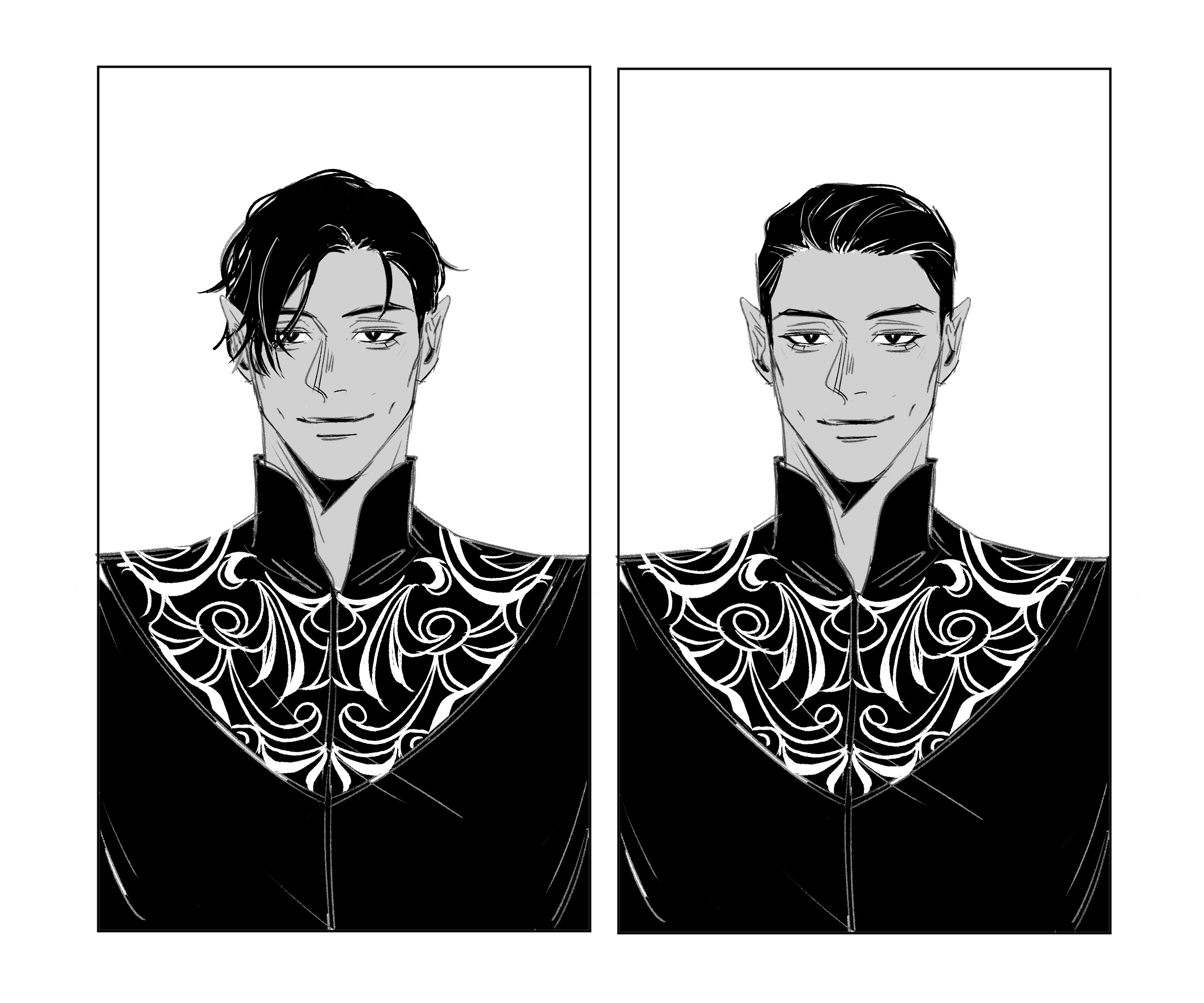 1boy a_court_of_thorns_and_roses_(series) black_hair border closed_mouth collar formal_clothes greyscale highres looking_at_viewer male_focus monochrome multiple_views opfuzhead pointy_ears portrait rhysand_(acotar) short_hair simple_background smile suit upper_body white_background white_border