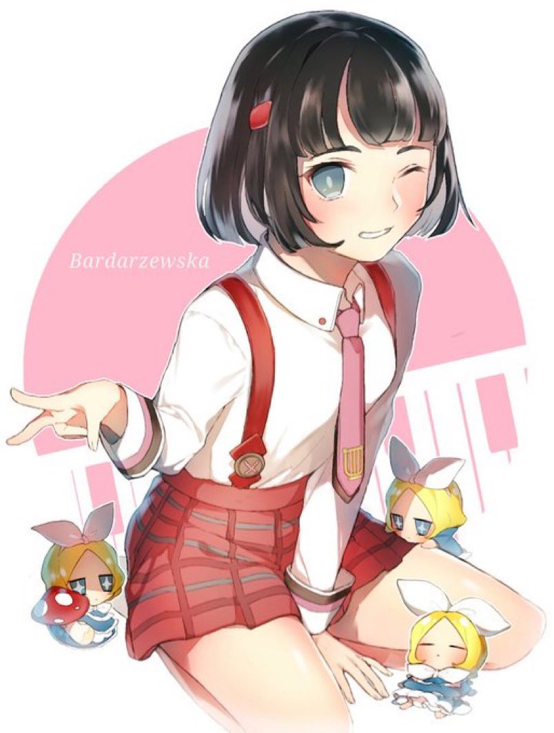 1girl black_hair blue_eyes blush character_doll classicaloid doll grey_eyes grin kneeling mushroom necktie one_eye_closed pink_necktie pyotr_illyich_tchaikovsky_(classicaloid) shirt short_hair smile suspenders tarutaru_s0urce tekla_badarzewska-baranowska_(classicaloid) white_shirt