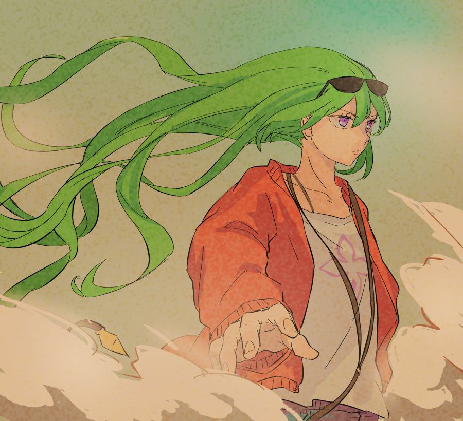 1boy adapted_costume androgynous commentary_request cosplay dust_cloud enkidu_(fate) expressionless eyewear_on_head fate/grand_order fate_(series) green_hair hatsune_miku hatsune_miku_(cosplay) himeko_(nico6v6pachi) jacket kingu_(fate) long_hair male_focus parody purple_eyes red_jacket shirt solo suna_no_wakusei_(vocaloid) sunglasses upper_body very_long_hair vocaloid white_shirt