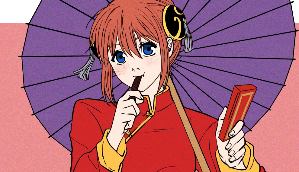 1girl blue_eyes blush bun_cover candy china_dress chinese_clothes chocolate chocolate_bar double_bun dress eating food gintama hair_between_eyes hair_bun high_collar holding holding_food holding_umbrella kagura_(gintama) long_sleeves looking_at_viewer oil-paper_umbrella orange_hair pkkjn8 purple_umbrella red_shirt shirt short_hair sidelocks smile solo umbrella upper_body