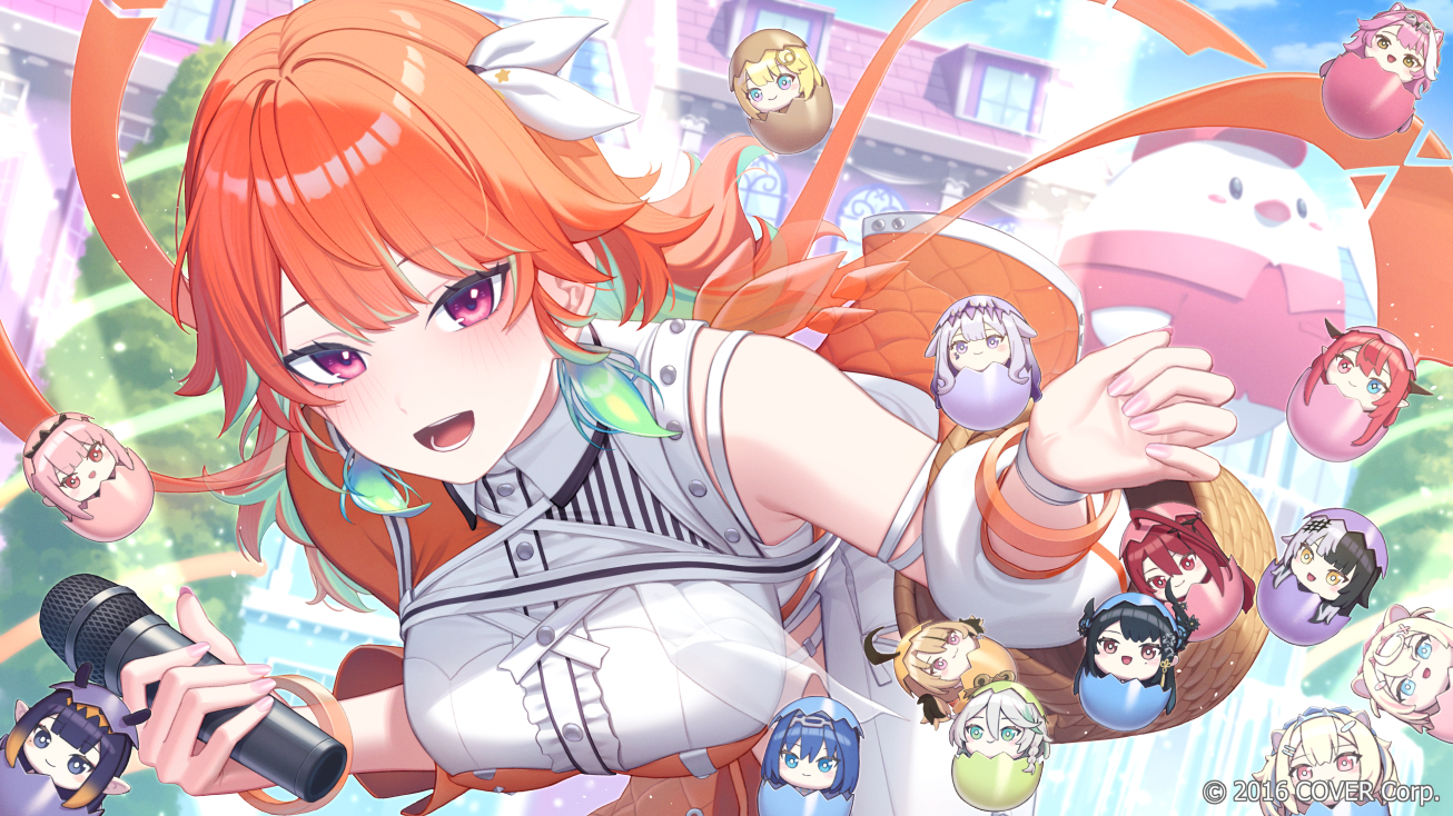 1girl :d asymmetrical_clothes basket blurry blurry_background breasts cecilia_immergreen center_frills collared_shirt colored_inner_hair commentary copyright_notice day detached_sleeves earrings elizabeth_rose_bloodflame english_commentary feather_earrings feathers fingernails frills fuwawa_abyssgard gigi_murin gradient_hair green_feathers green_hair hair_flaps hands_up holding holding_basket holding_microphone holojustice hololive hololive_english hololive_idol_uniform_(color_rise) idol_clothes irys_(hololive) jewelry kfp_employee_(takanashi_kiara) koseki_bijou long_hair looking_at_viewer medium_breasts microphone mococo_abyssgard mori_calliope multicolored_hair multicolored_shirt nerissa_ravencroft ninomae_ina'nis official_alternate_costume official_art open_mouth orange_hair orange_shirt ouro_kronii outdoors pants puffy_detached_sleeves puffy_short_sleeves puffy_sleeves purple_eyes raora_panthera resu_desu shiori_novella shirt short_sleeves single_detached_sleeve single_pantsleg single_sleeve smile solo takanashi_kiara virtual_youtuber watson_amelia white_pants white_shirt