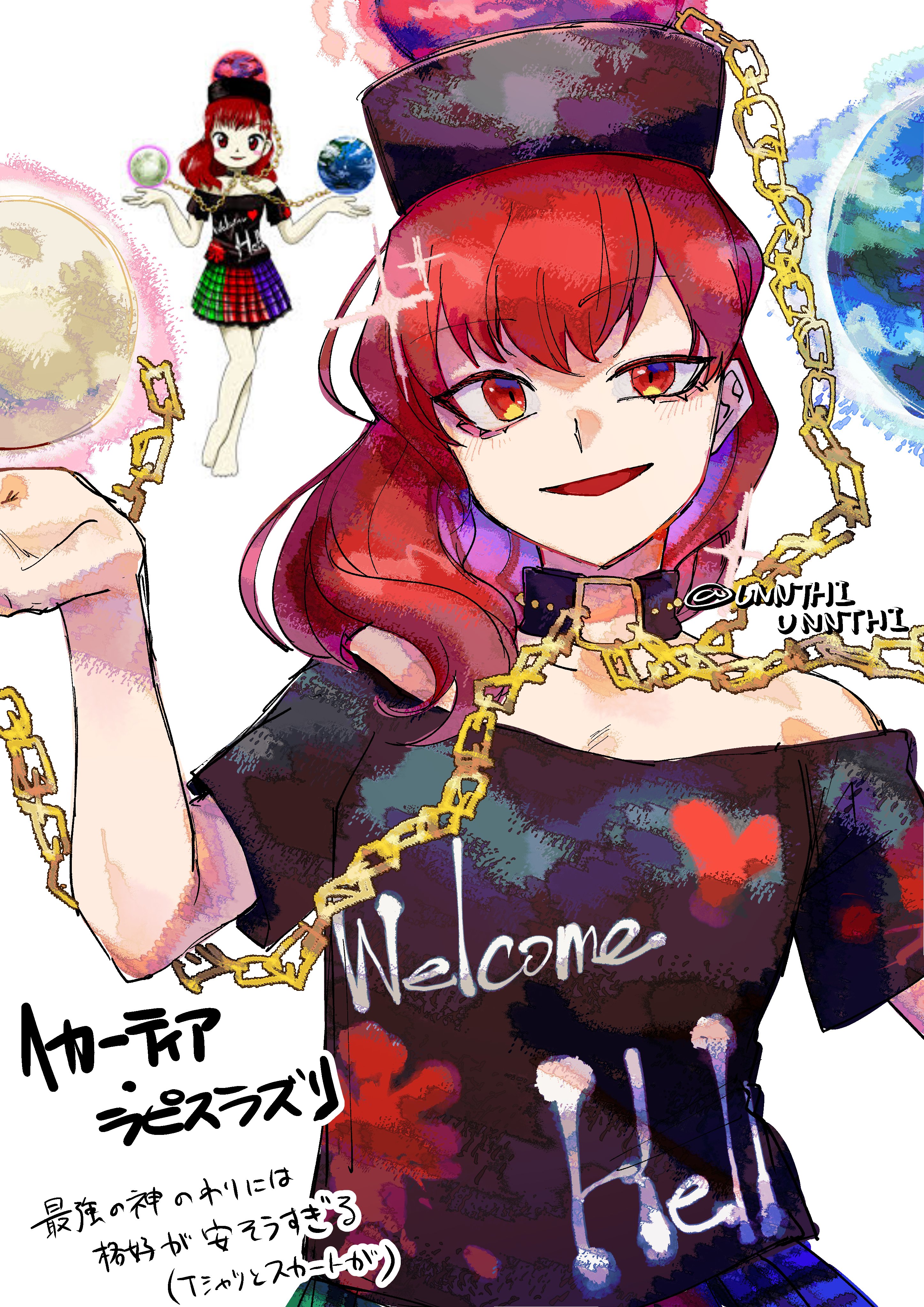 1girl absurdres artist_name bare_shoulders black_choker black_hat black_shirt blue_skirt chain choker clothes_writing colored_inner_hair commentary_request earth_(ornament) gold_chain green_skirt hands_up hat heart heart_print hecatia_lapislazuli highres looking_at_viewer medium_hair moon_(ornament) multicolored_hair multicolored_skirt off-shoulder_shirt off_shoulder open_mouth plaid_clothes plaid_skirt purple_hair red_eyes red_hair red_skirt shirt short_sleeves simple_background skirt smile solo t-shirt touhou translation_request underworld_(ornament) unnthiunnthi upper_body white_background zun_(artist)