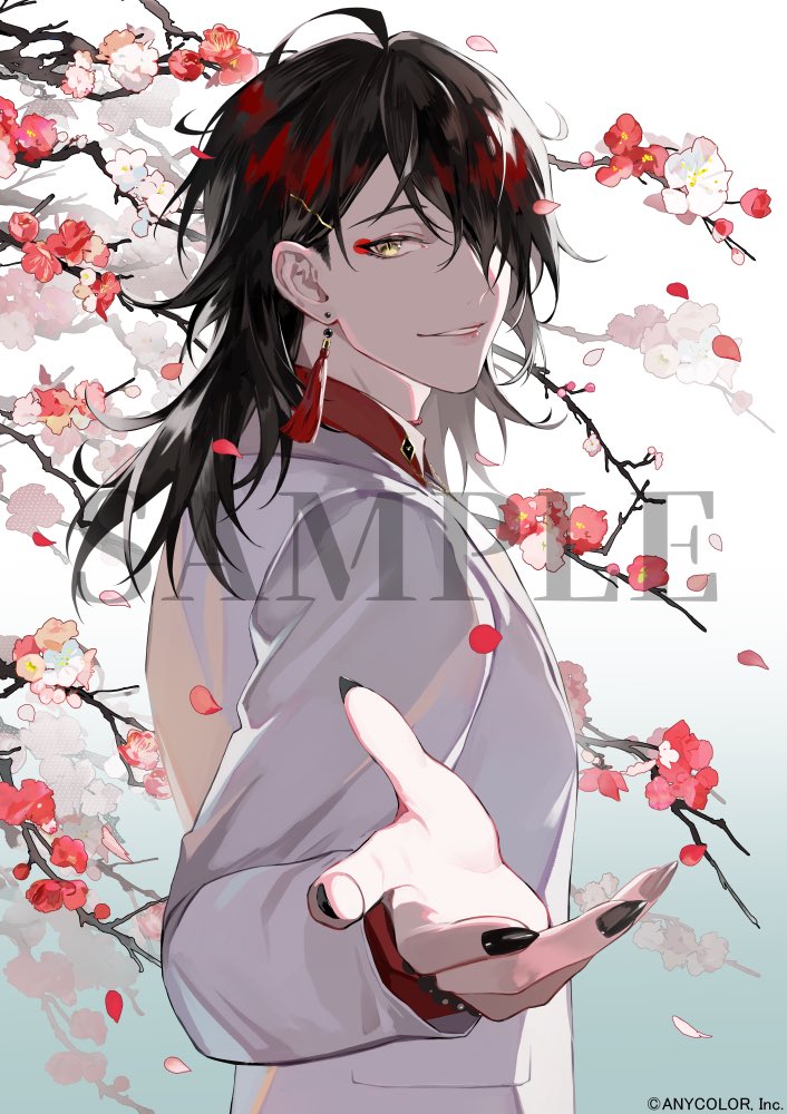 1boy black_hair black_nails branch commentary commentary_request copyright_notice earrings english_commentary flower formal_clothes gradient_background jewelry lam_(ramdayo) makeup male_focus medium_hair mixed-language_commentary nijisanji nijisanji_en official_art petals red_hair sample_watermark solo suit tassel tassel_earrings virtual_youtuber vox_akuma vox_akuma_(1st_costume) watermark white_suit yellow_eyes
