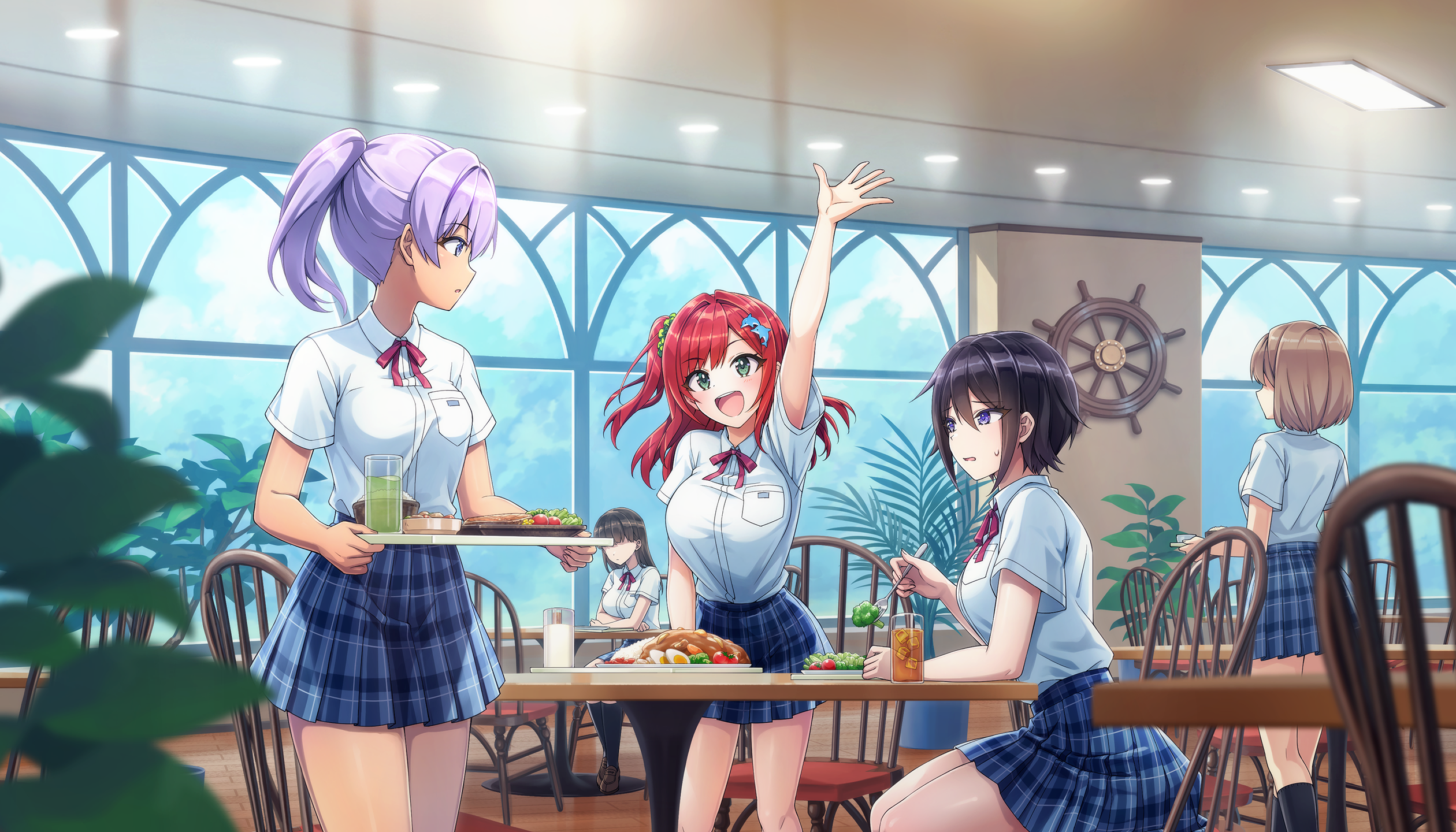 5girls :d black_hair blue_skirt breasts cup dark-skinned_female dark_skin dolphin_hair_ornament dolphin_wave game_cg green_eyes green_scrunchie hair_ornament hair_scrunchie highres holding holding_tray indoors large_breasts looking_at_another multiple_girls neck_ribbon non-web_source official_art ootomo_takuji open_mouth plaid_clothes plaid_skirt ponytail purple_eyes red_hair red_ribbon ribbon sakimiya_iruka school_uniform scrunchie self-datamine shirt short_hair short_sleeves skirt smile souma_hayate suminoe_shion tray white_shirt