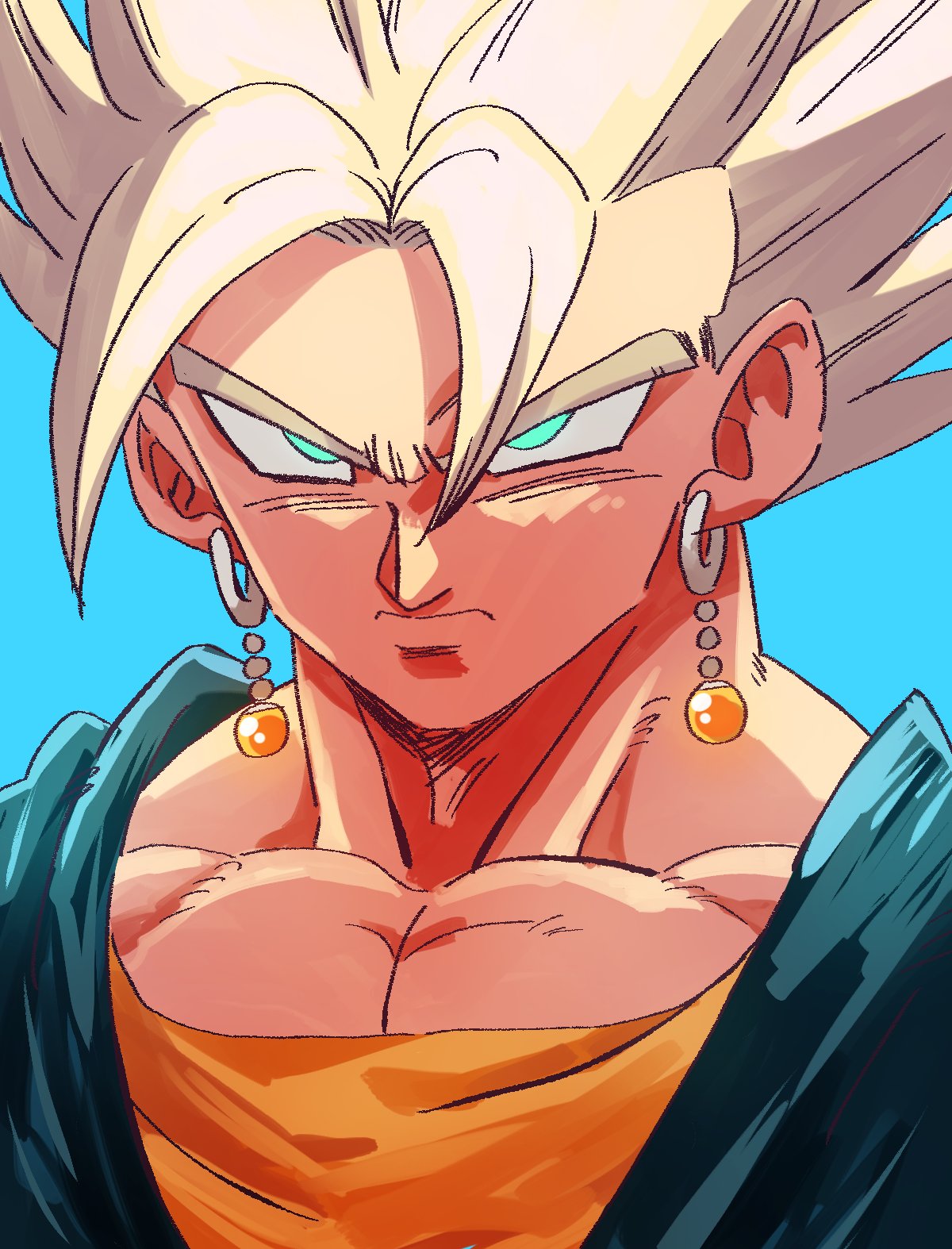 1boy blonde_hair blue_background blue_shirt dragon_ball dragonball_z earrings green_eyes highres jewelry male_focus muscular muscular_male orange_shirt potara_earrings shikemoku shirt simple_background solo super_saiyan super_saiyan_1 upper_body vegetto