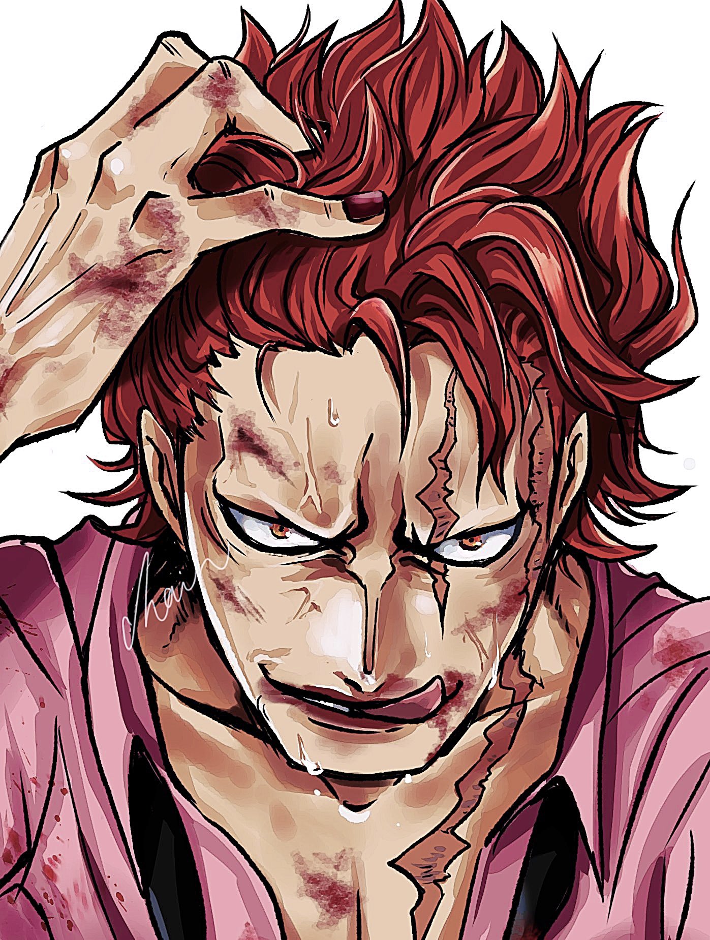 1boy anarchyintheek blood blood_on_hands close-up commentary_request eustass_kid hands_in_own_hair highres looking_at_viewer male_focus one_piece pink_shirt red_hair scar scar_on_face shirt short_hair simple_background smile solo tongue tongue_out white_background