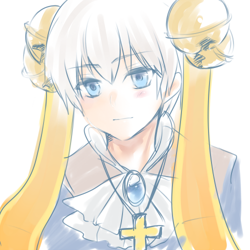 1boy ascot bell biolo_(ragnarok_online) blue_eyes blush brooch closed_mouth commentary_request expressionless hair_bell hair_ornament jewelry jingle_bell looking_at_viewer lowres male_focus ragnarok_online shirokuro_(erisnoa) simple_background solo upper_body white_ascot white_background white_hair