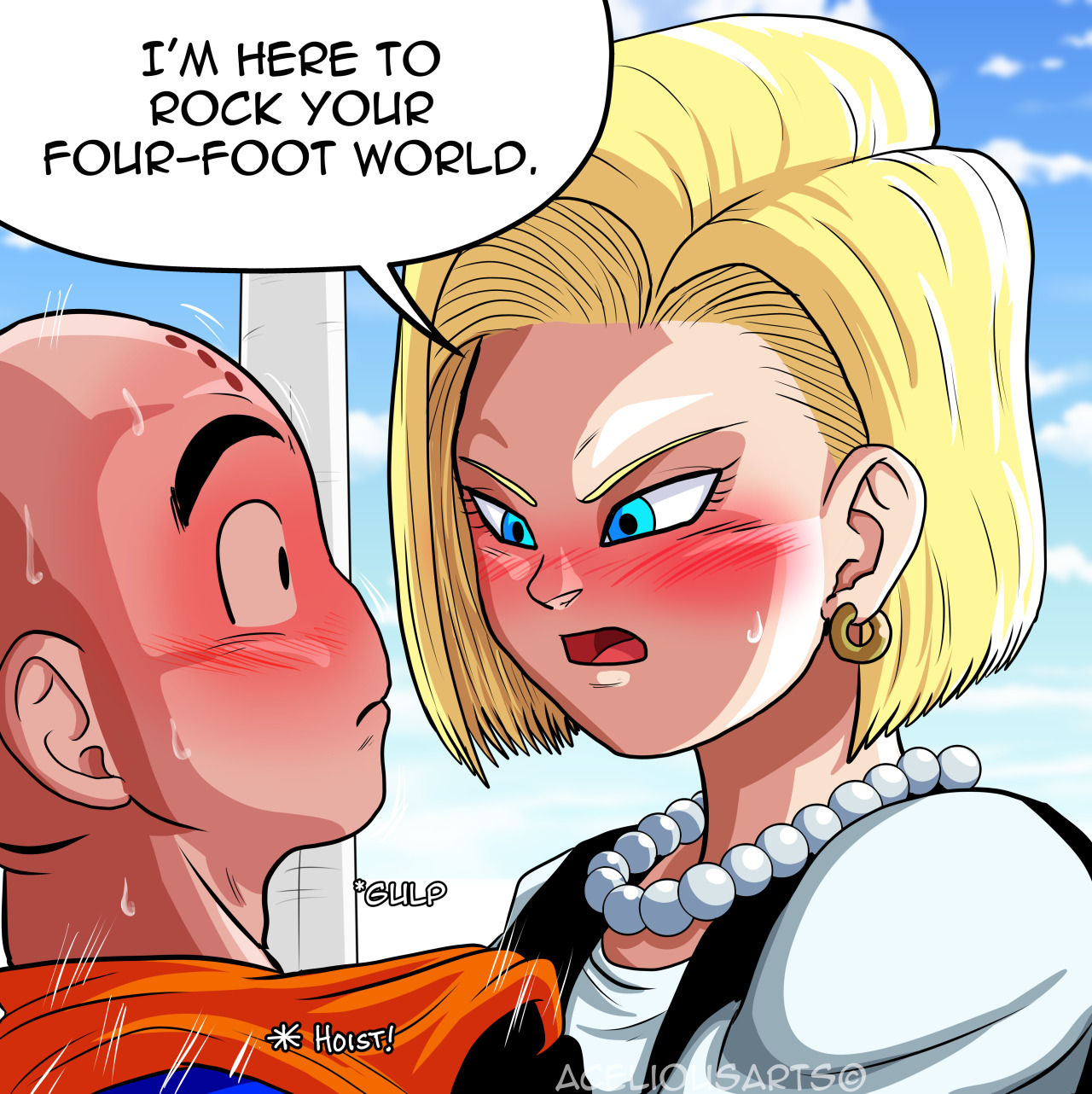 1boy 1girl acelewdarts android_18 bald bald_male black_eyes blonde_hair blue_eyes blush couple dragon_ball embarrassed english_text highres kuririn muscular muscular_male nervous_sweating speech_bubble sweat