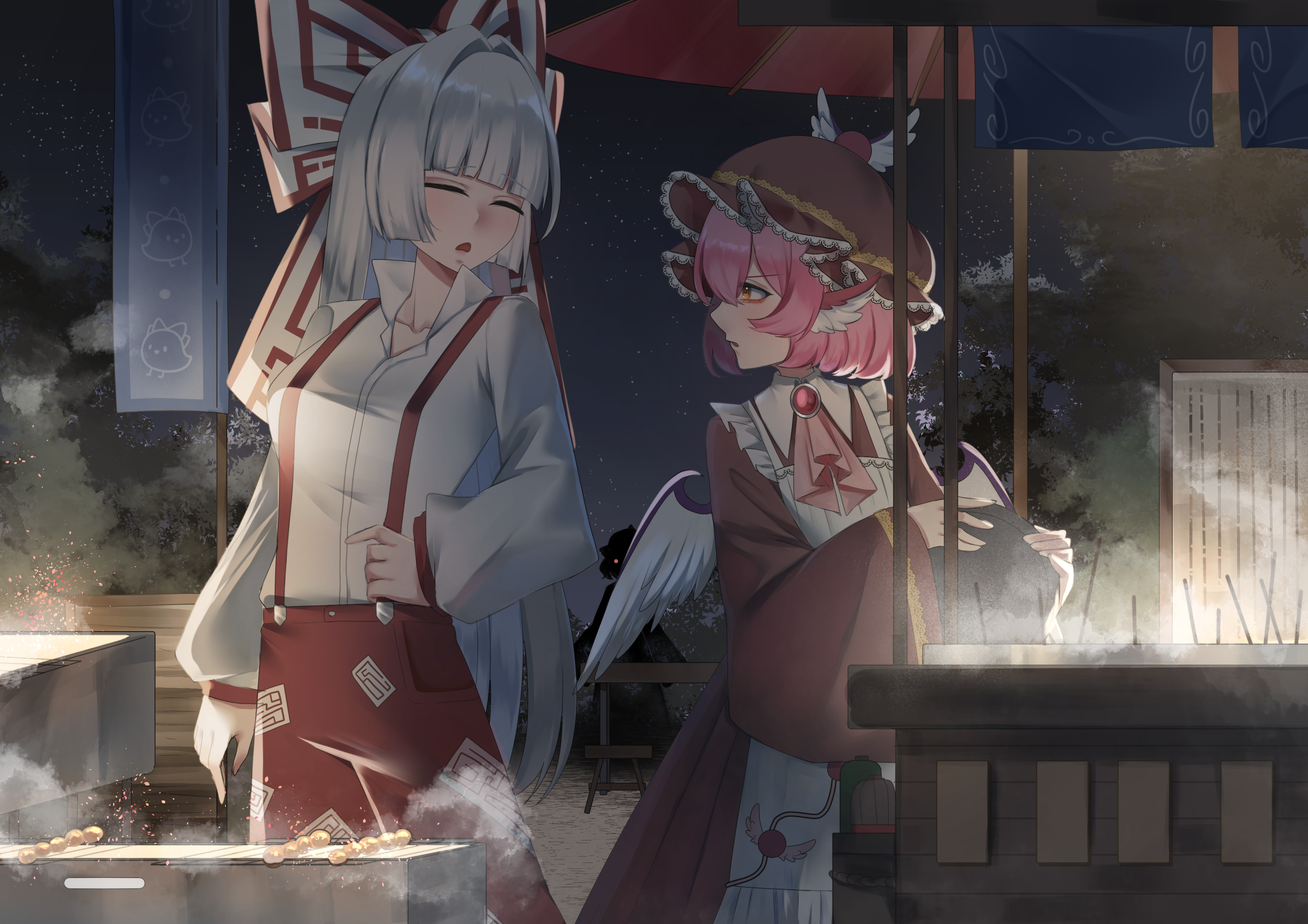 3girls absurdres animal_ears apron ascot banner bird_ears bird_wings bow closed_eyes collared_shirt dress food food_stand fujiwara_no_mokou grey_hair hair_bow hand_on_own_hip hat highres holding holding_plate impending_doom long_hair long_sleeves multiple_girls mystia_lorelei no_noru open_mouth pants parasol pink_hair plate red_pants saigyouji_yuyuko shirt short_hair silhouette skirt stool suspenders table touhou umbrella white_apron white_dress wings yellow_eyes