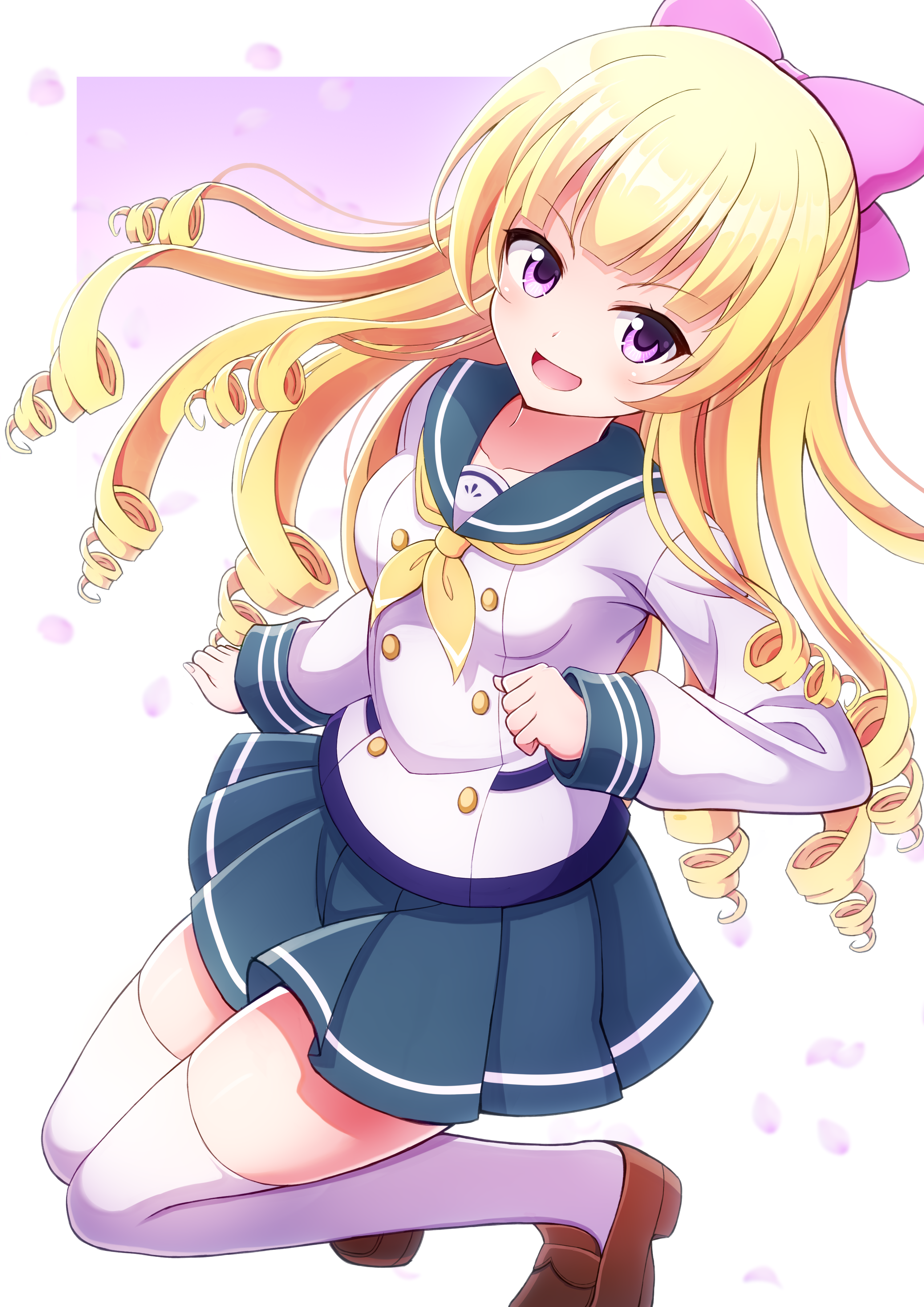 1girl absurdres battle_girl_high_school blonde_hair blue_sailor_collar blue_skirt border bow brown_shoes hair_bow highres iwarihhi long_hair long_sleeves looking_at_viewer neckerchief open_mouth pink_bow purple_eyes ringlets sailor sailor_collar school_uniform sendouin_kaede shirt shoes skirt solo thighhighs white_border white_shirt white_thighhighs yellow_neckerchief
