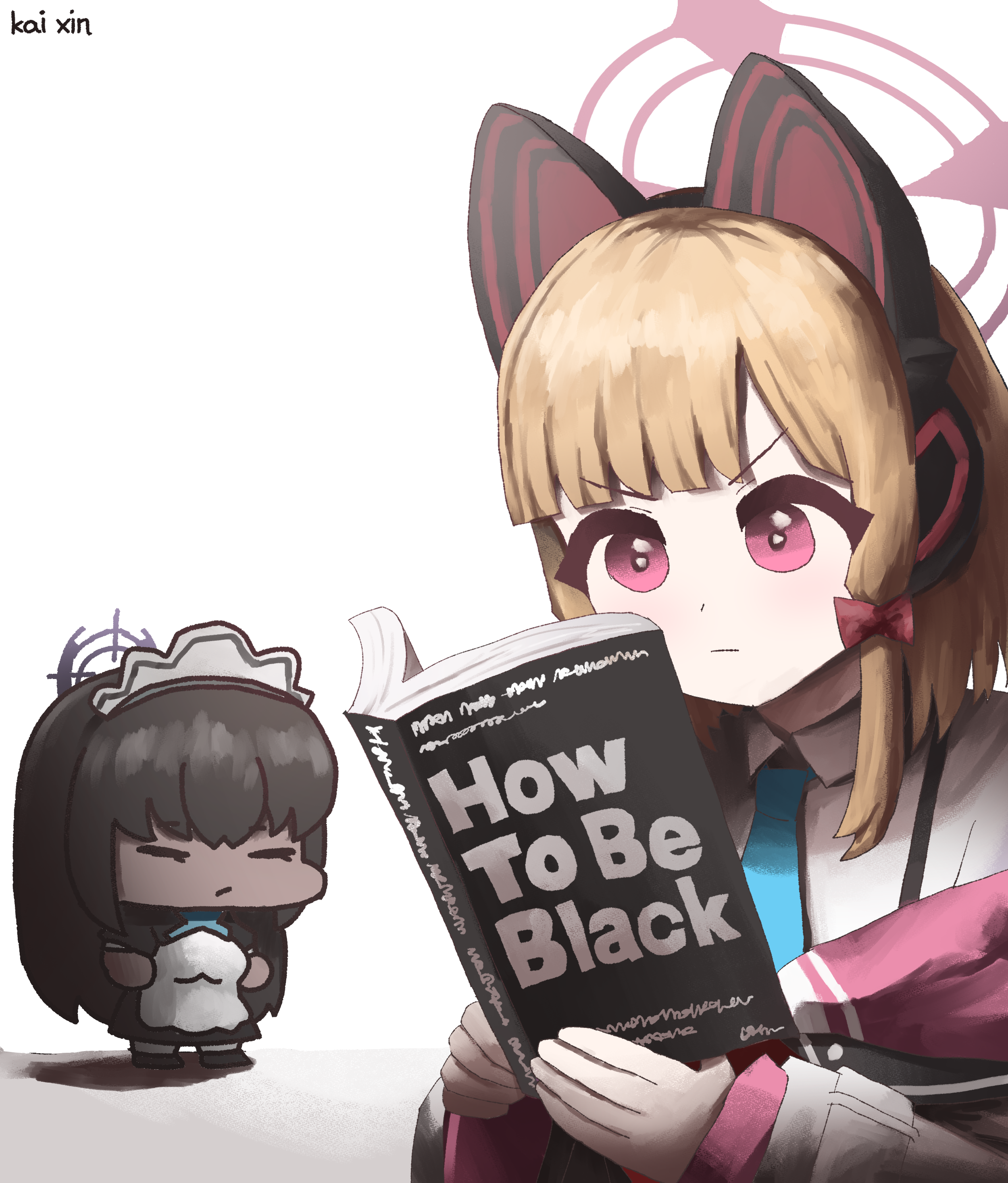 2girls absurdres animal_ear_headphones animal_ears blonde_hair blue_archive blunt_bangs book cat_ear_headphones cat_ears chibi commentary dark-skinned_female dark_skin english_text fake_animal_ears hair_between_eyes halo headphones highres holding holding_book kai_xin karin_(blue_archive) long_hair long_sleeves meme momoi_(blue_archive) multiple_girls open_book racist_momoi_(meme) reading sechi_(sechihyeo)_(style) short_hair short_sleeves sidelocks simple_background very_dark_skin